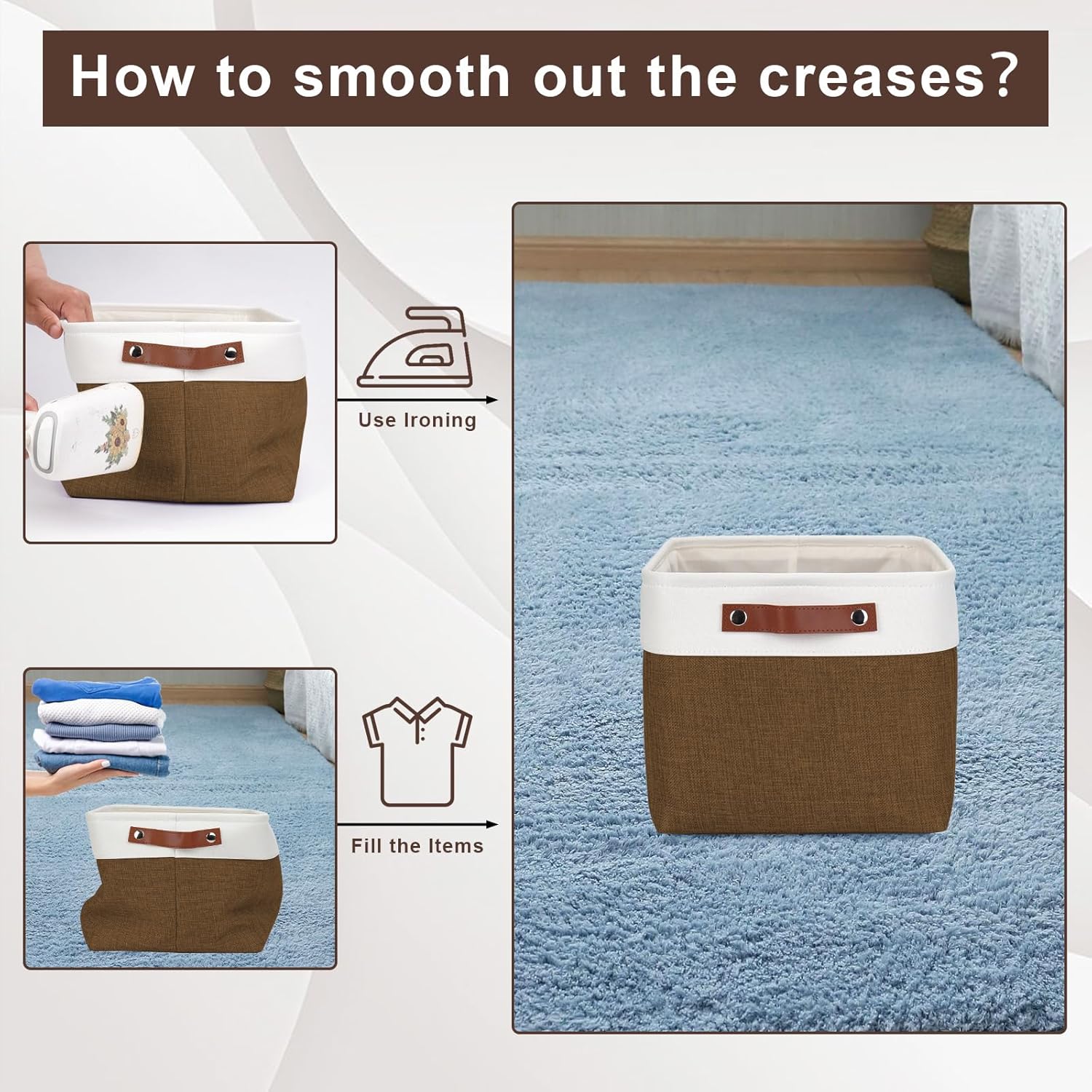 - 【Maintenance & Care Tip】 - Collapsible design for space saving. Our foldable baskets comes in a compression packing which may result in wrinkled storage bin during the long transit. Get rid of the wrinkles by either stuffing the fabric storage bins with blankets and pillows for a few days or steam iron them at low-heat setting. The organization baskets are easy to clean, you can dust the basket with a soft cloth with light soapy water when needed. Not recommended to machine wash.