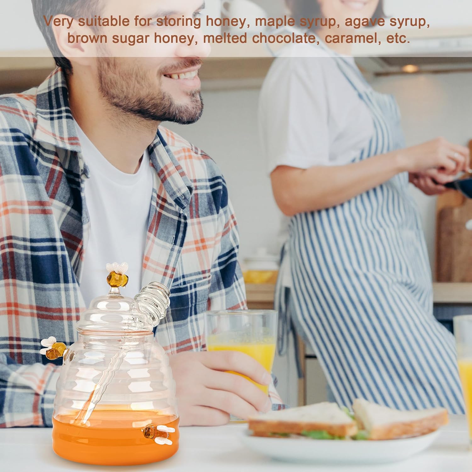 - The honey pot is made of classy high borosilicate glass and boasts an elegant bee design, suitable for decorative use on kitchen counters and dining tables