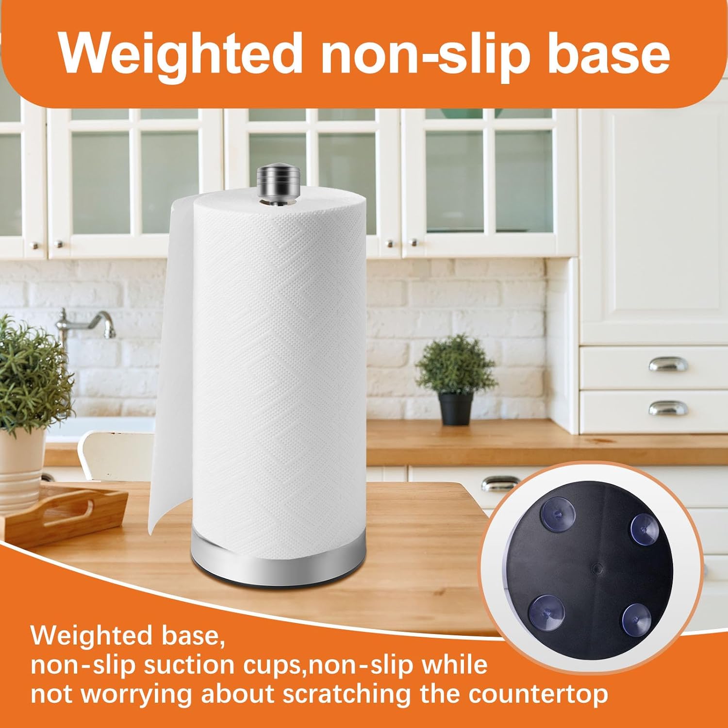 - Heavy base/Stability and Scratch Protection: This suction cup paper towel holder features a weighted base with four powerful anti-slip suction cups, ensuring unwavering stability and zero slipping on any level surface. This design not only protects your countertops from scratches but also guarantees that your countertop paper towel holder remain steady when tearing off sheets