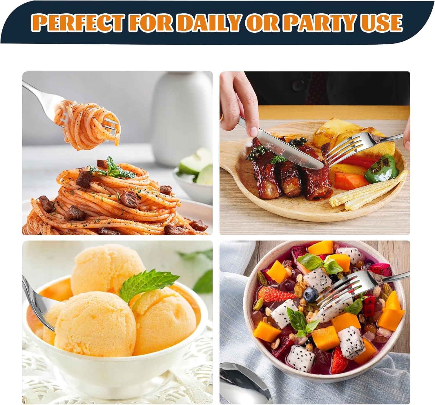 - ERGONOMIC HANDLES DESIGN: The silverware set for 4 adopts mirror design, highlighting the modern fashion sense, adding more flavor to your table setting. The highly mirror-polished smooth edges of the cutlery with no rough spots or sharp edges don't cause any discomfort to your mouth. Meanwhile, the flatware set for 4 has an ergonomically designed grip that conforms to the curve of the human hand, making it more comfortable for you to hold and enjoy your mealtime with ease.