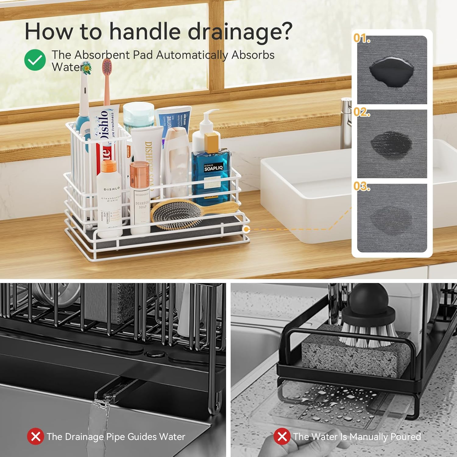 - 【Instant Dry Sink】Our bottom uses a diatomaceous earth absorbent pad, which automatically absorbs water and dries in 60 seconds; No longer need to manually pour water