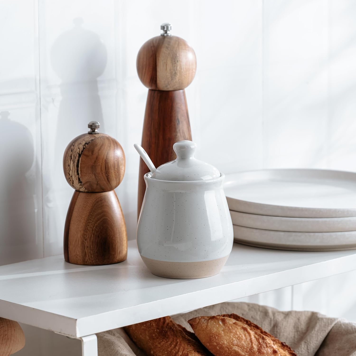 - Sugar Bowl with Lid and Spoon: This 10-ounce sugar bowl (2.7" diameter x 4.7" height) is perfect for daily use. Ideal for storing granulated sugar, sugar cubes, sweeteners, salt, spices, or even coffee beans.