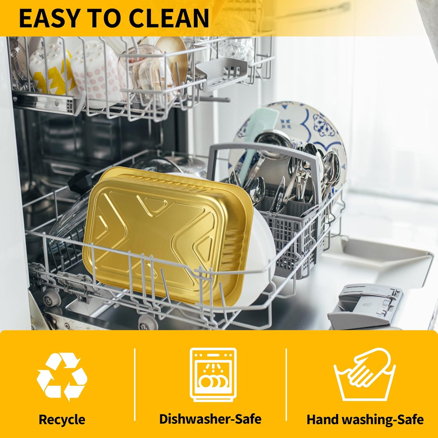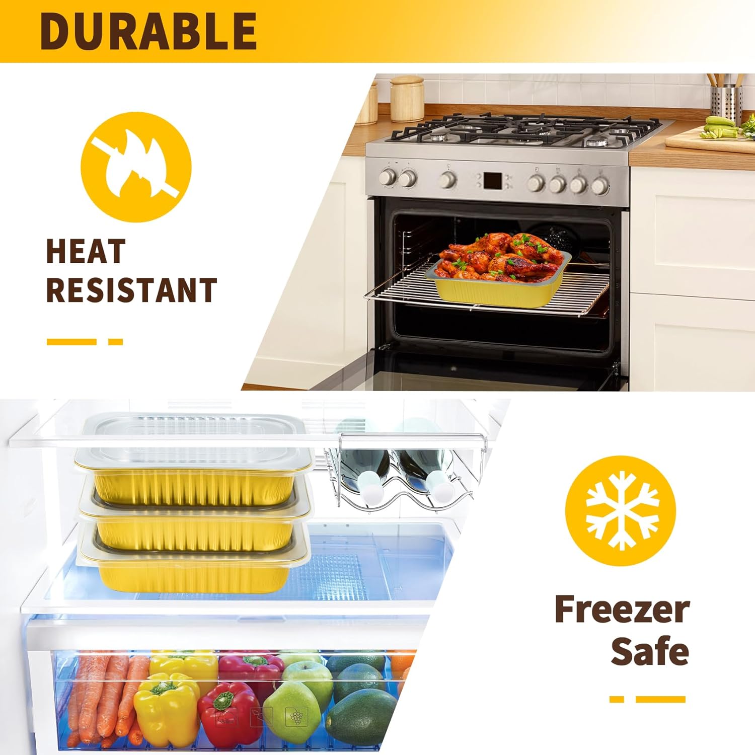 - 【Safety & Time Saving】JARDLITE gold aluminum foil pan is made of high quality aluminum material, which is 2 times harder than other silver aluminum foil pans, lightweight and sturdy, not easy to deform, high temperature resistant, and can withstand oven temperatures up to 600°F. Food grade plastic cover. Does not contain harmful substances, healthy and safe. Use these takeout containers to pack food and do all the work, saving you time!