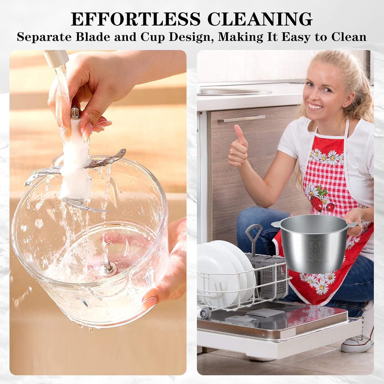 - ăEasy to Clean & AssembleăAssembling is quick.Removable blades detach instantly. Nesting design with dishwasher-safe bowls (tested up to 158°F/70°C) stacks neatly to save space. Wipe the motor base with a damp clothâno disassembly needed.