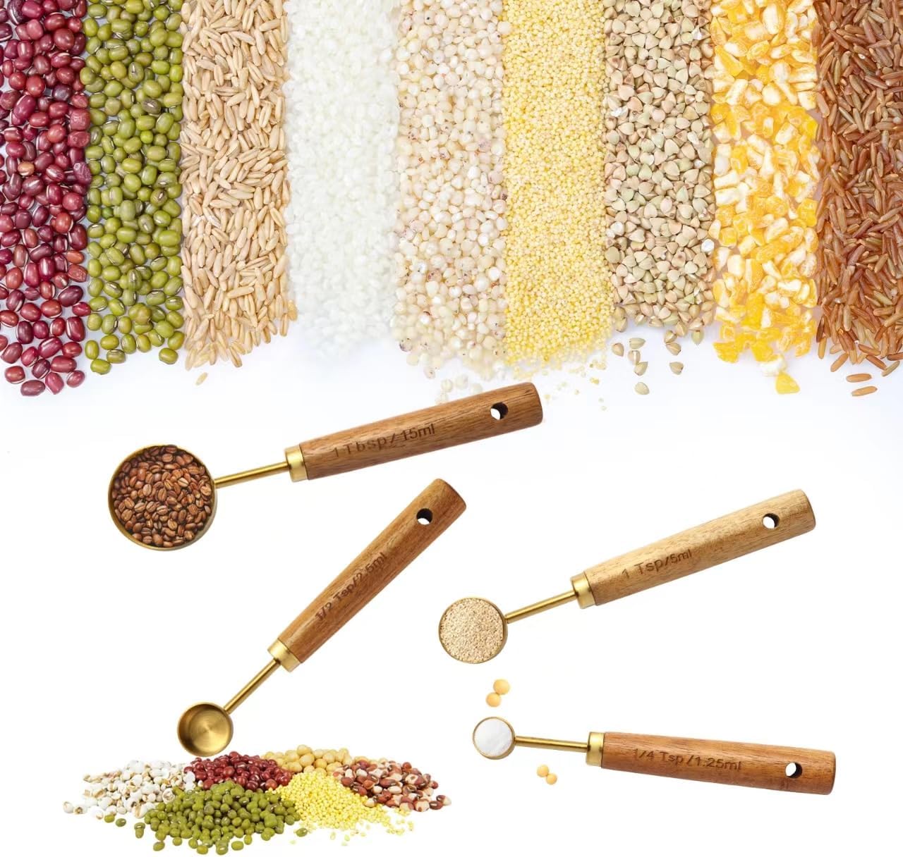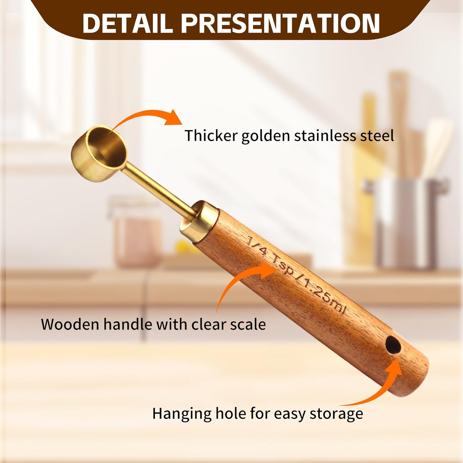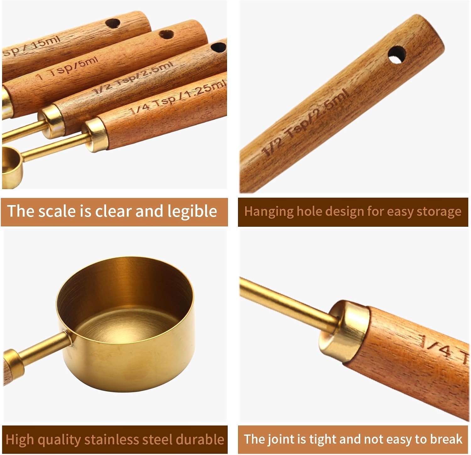 - 【Non-slip handle】Our golden stainless steel measuring spoons handle is made of high-quality wood and is carefully polished for a comfortable and non-slip grip. The handle is clearly marked with metric measurement marks to ensure the highest precision and accuracy.