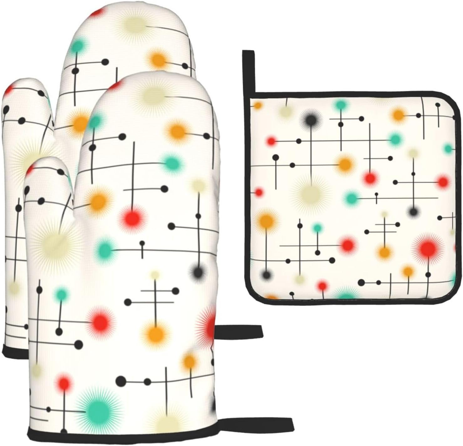 Mid Century Modern Oven Mitts and Pot Holders Sets of 3 Heat Resistant Non Slip Retro Kitchen Gloves Hot Pads for Cooking BBQ Grilling Baking