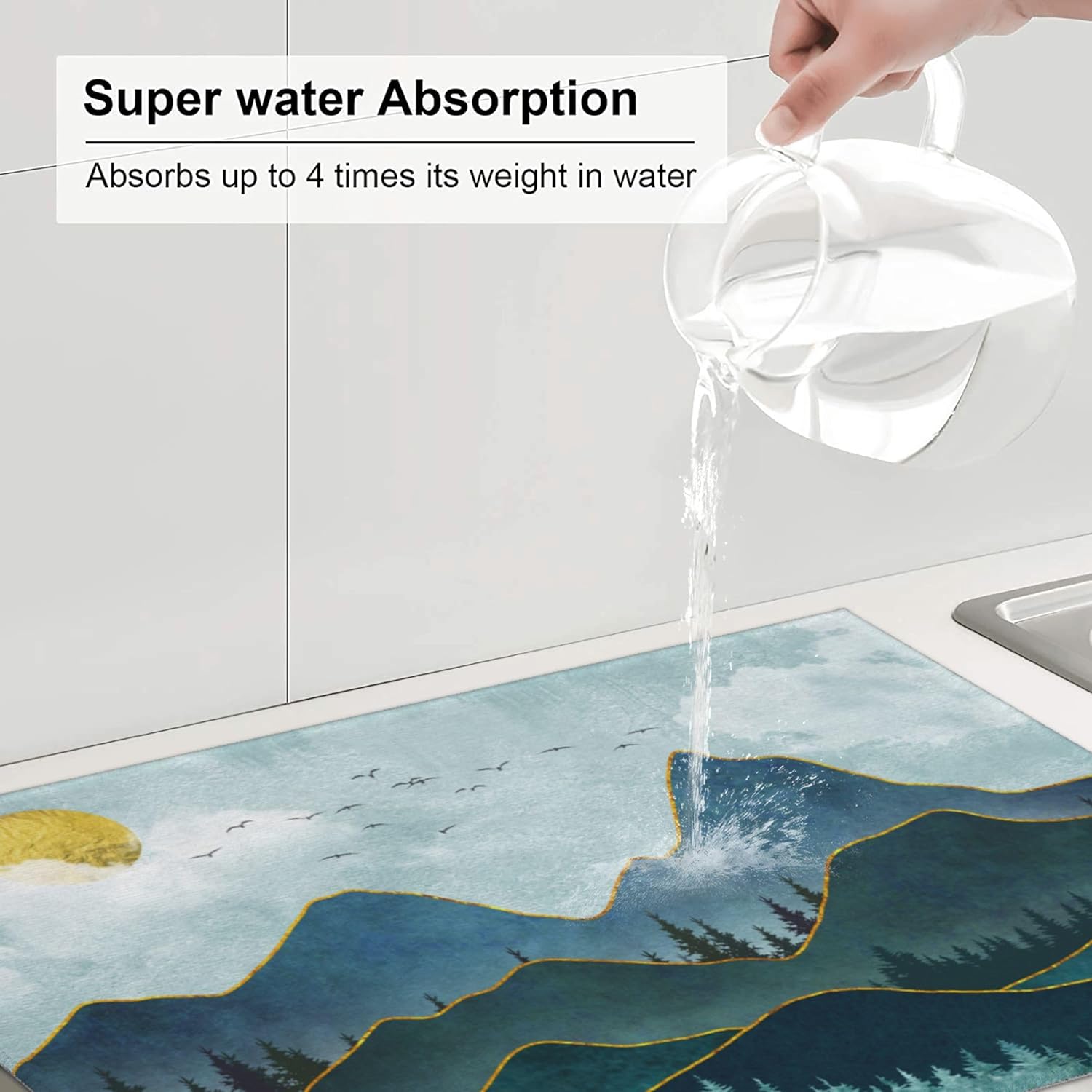 - Kitchen drying mat made of absorbing microfiber, and the middle is made of composite sponge, soft absorbent, non-slip, reversible, reusable