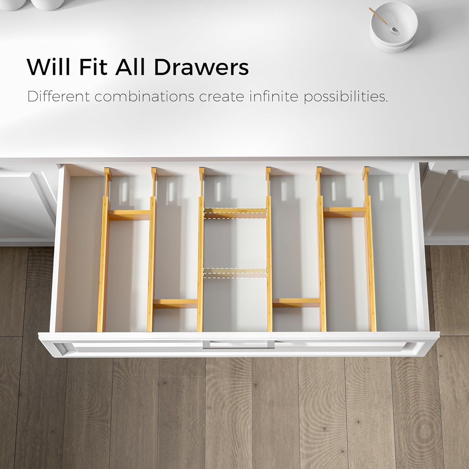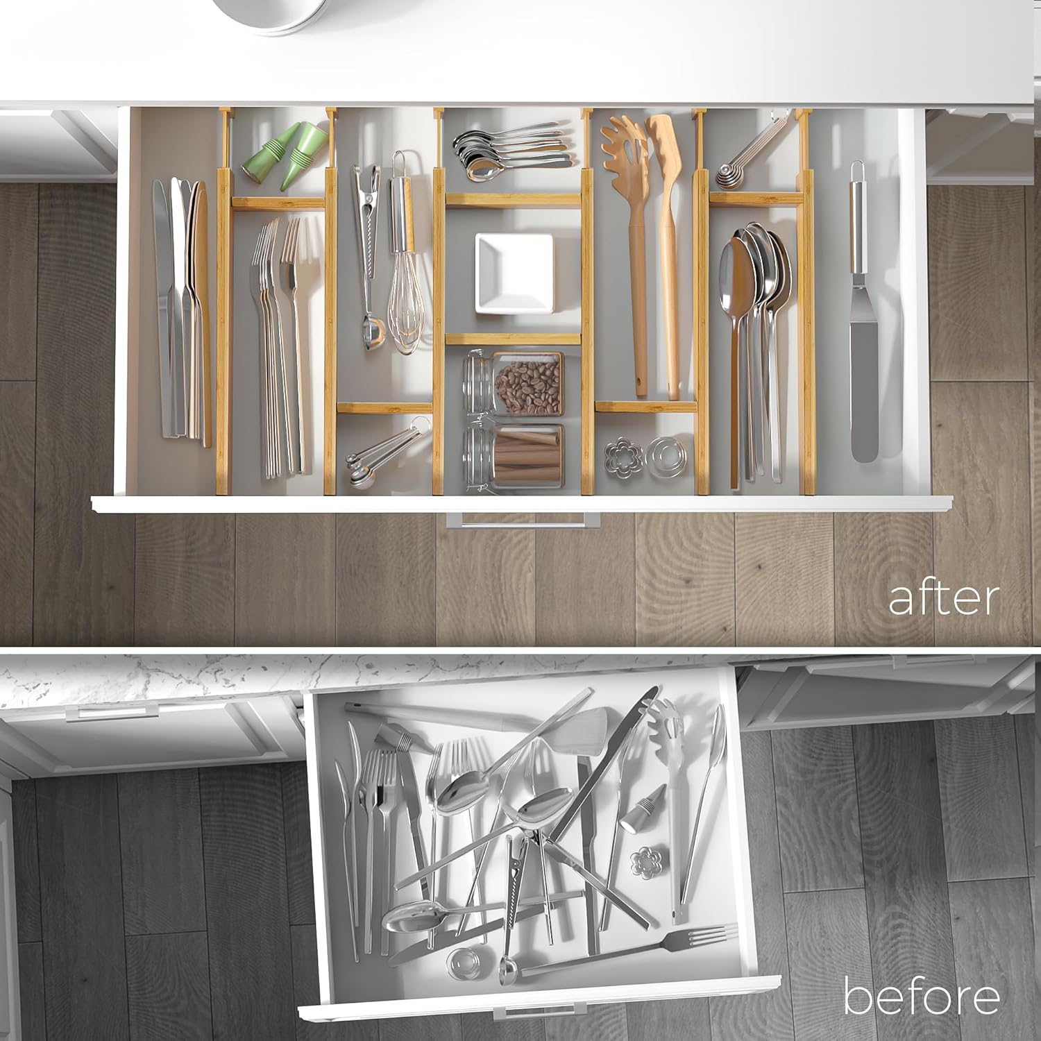 - Premium Quality: Crafted from sustainably sourced, premium-quality bamboo, this kitchen drawer organizer features a strong spring-loaded mechanism that ensures smooth operation and protects your drawers from scratches