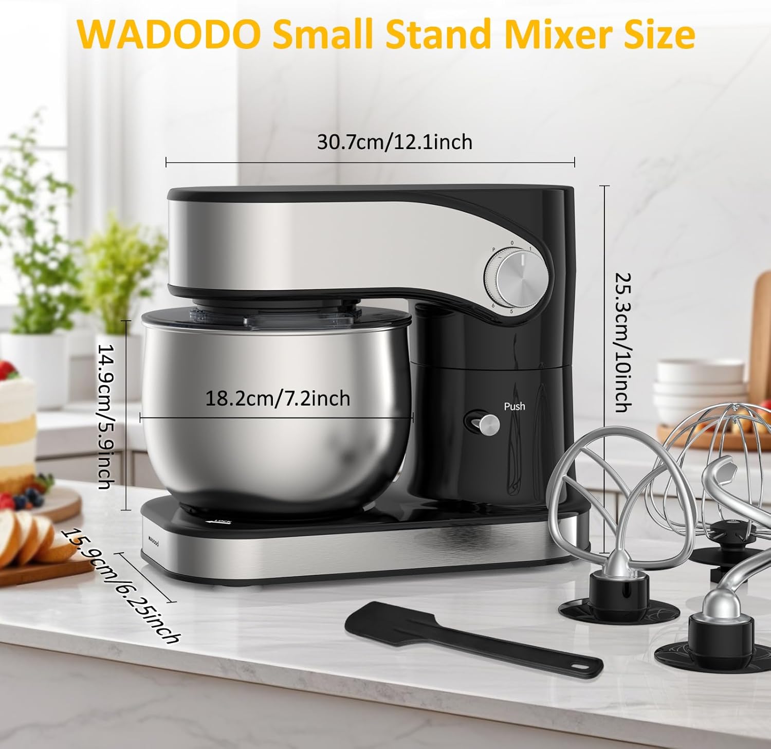 - ăMore Healthier & SaferăWADODO Small Stand Mixer (12.1"D x 6.25"W x 10"H) made with 304 food-grade stainless steel bowls and part of the body, heat-resistant, easy to clean, safe for direct food contact, and more sturdy and durable. Our mixer is designed to be compact, which helps save space.