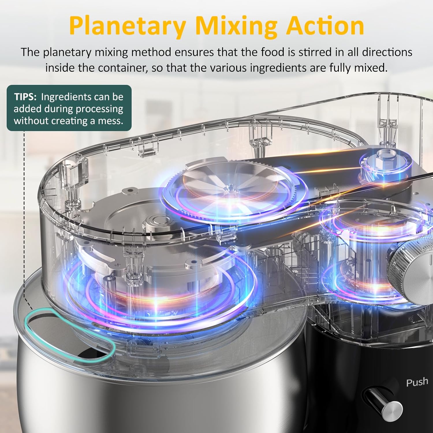 - ăUniform And Thorough MixingăAchieve thorough mixing with our stand mixer, featuring planetary mixing action that rotates attachments around the entire stainless steel bowl. Hands-free mixing, ensuring all ingredients are perfectly combined.