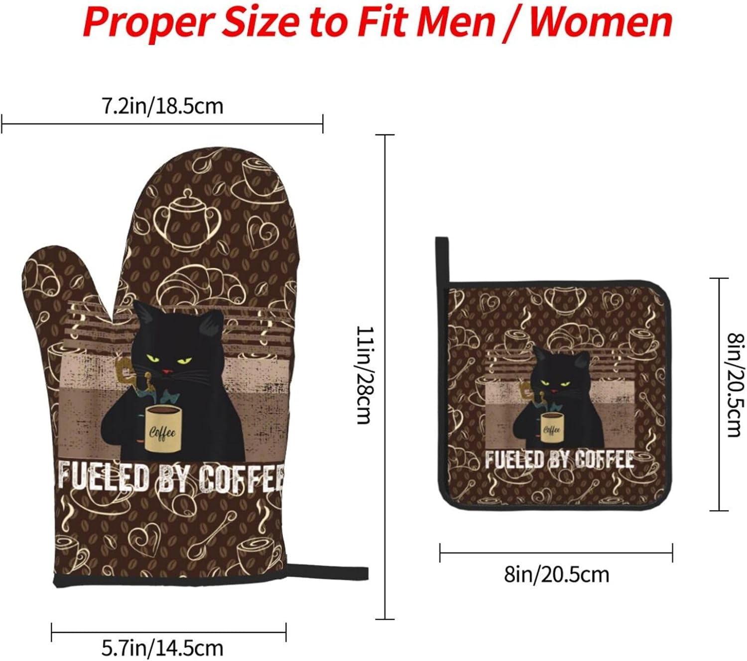 - Size: Kitchen oven gloves measure 7.2 x 11 inch and hot pads measure 8 x 8 inch