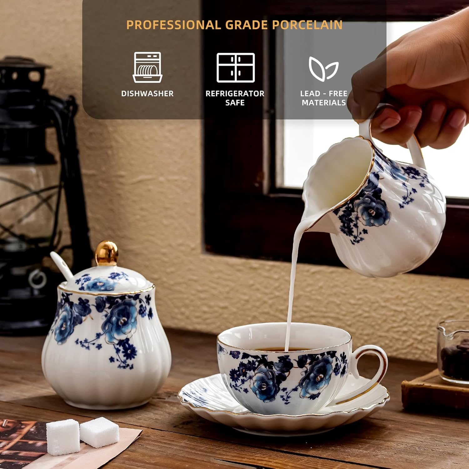 Ceramic Sugar and Creamer Set, 3 Piece with Cream Pitcher, Sugar Bowl with Lid and Spoon,Coffee and Tea Serving Set (White with blue flower)