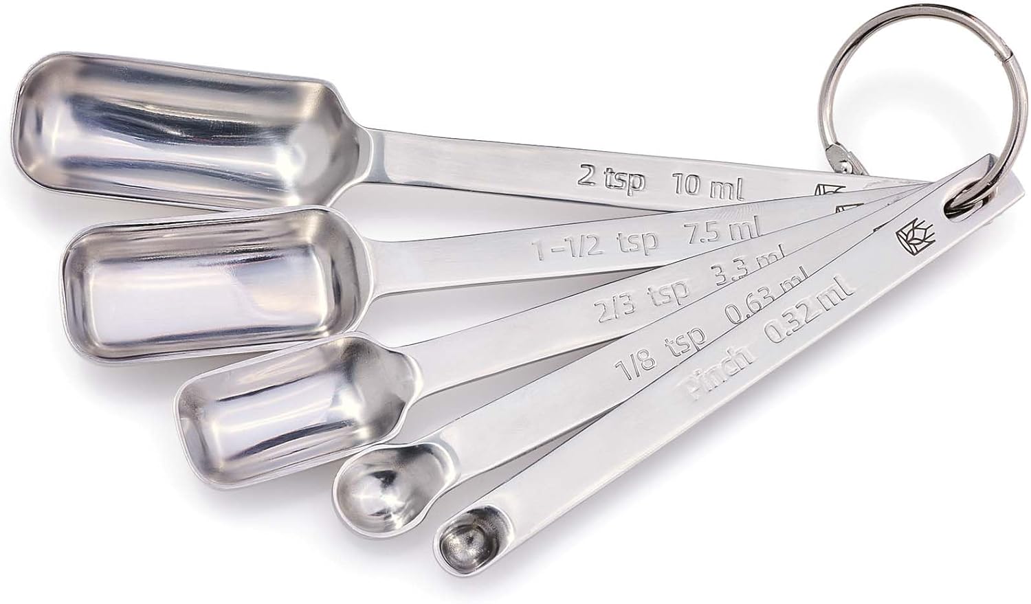 - Made from heavyweight polished 18/8 stainless steel; sturdy, durable, accurate; set of 5 includes pinch, 1β8, 2/3, 1-1β2, and 2-teaspoons