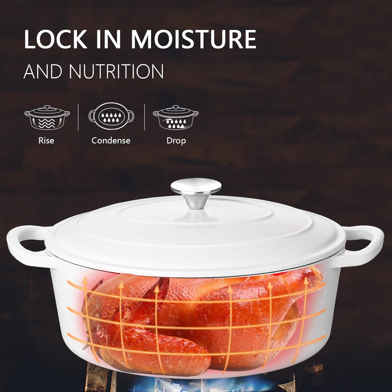 - Moisture-Rich Cooking, this enameled cast iron Dutch oven is design with circulating shower type lid, the raised design of the pot cover allows the water vapor circulates and locks inside the Dutch oven, fully releasing the flavor and nutrients of the ingredients, possess pretty heat retention performance