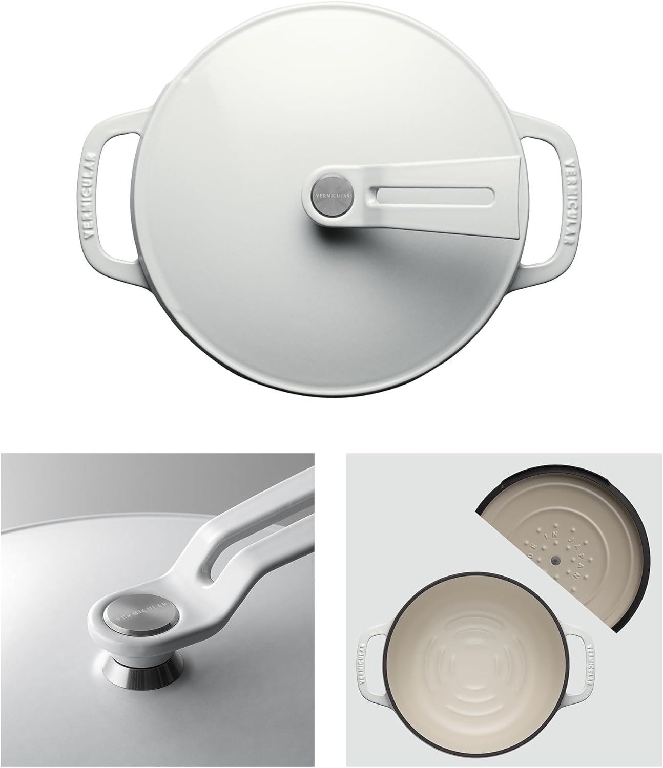- Instant Evaporation: With Vermicular’s proprietary enamel coating, the pot quickly eliminates surface moisture, making the pot ideal for fast cooking methods like searing, stir-frying, and steam-roasting.