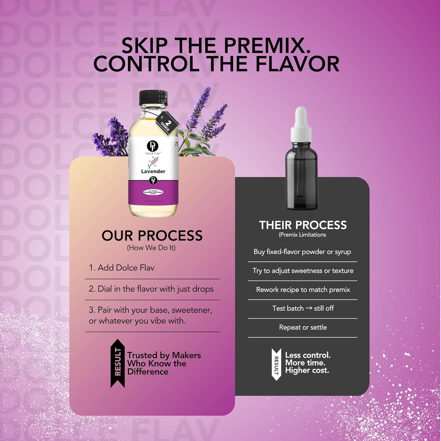 - Commitment to Refined Flavor: Our lavender flavoring, free from alcohol, sugar, and dyes, and proudly crafted in the USA, is a crucial addition to your kitchen. Whether you're making fragrant desserts, lavender-enhanced savory dishes, refreshing drinks, or aromatic confections, we're committed to supporting your culinary ventures with our superior lavender extract.