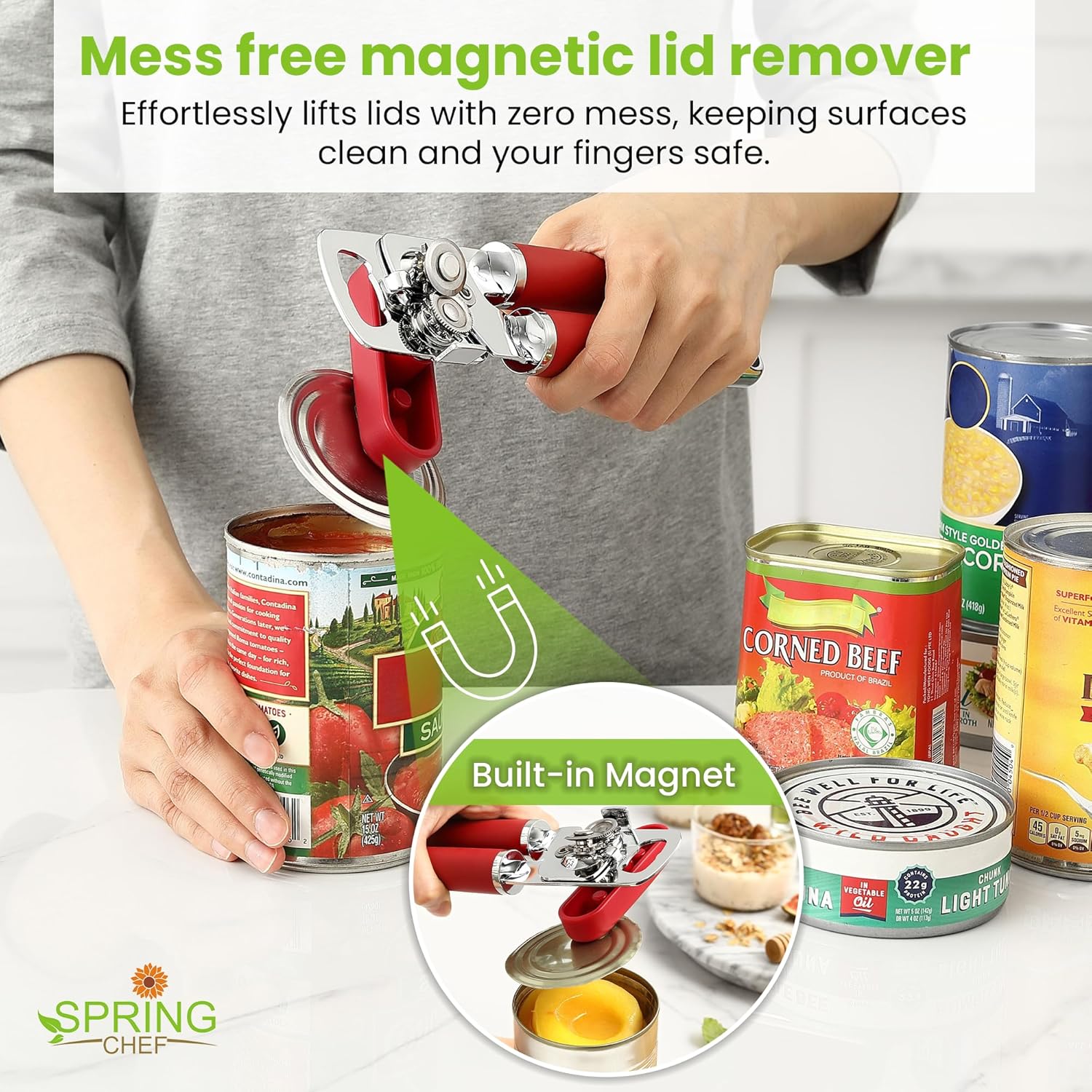 Spring Chef Stainless Steel Can Opener - Manual with Soft Grip Handles, Easy Turn, Heavy Duty Hand Can Opener for Seniors with Smooth Edge - Red
