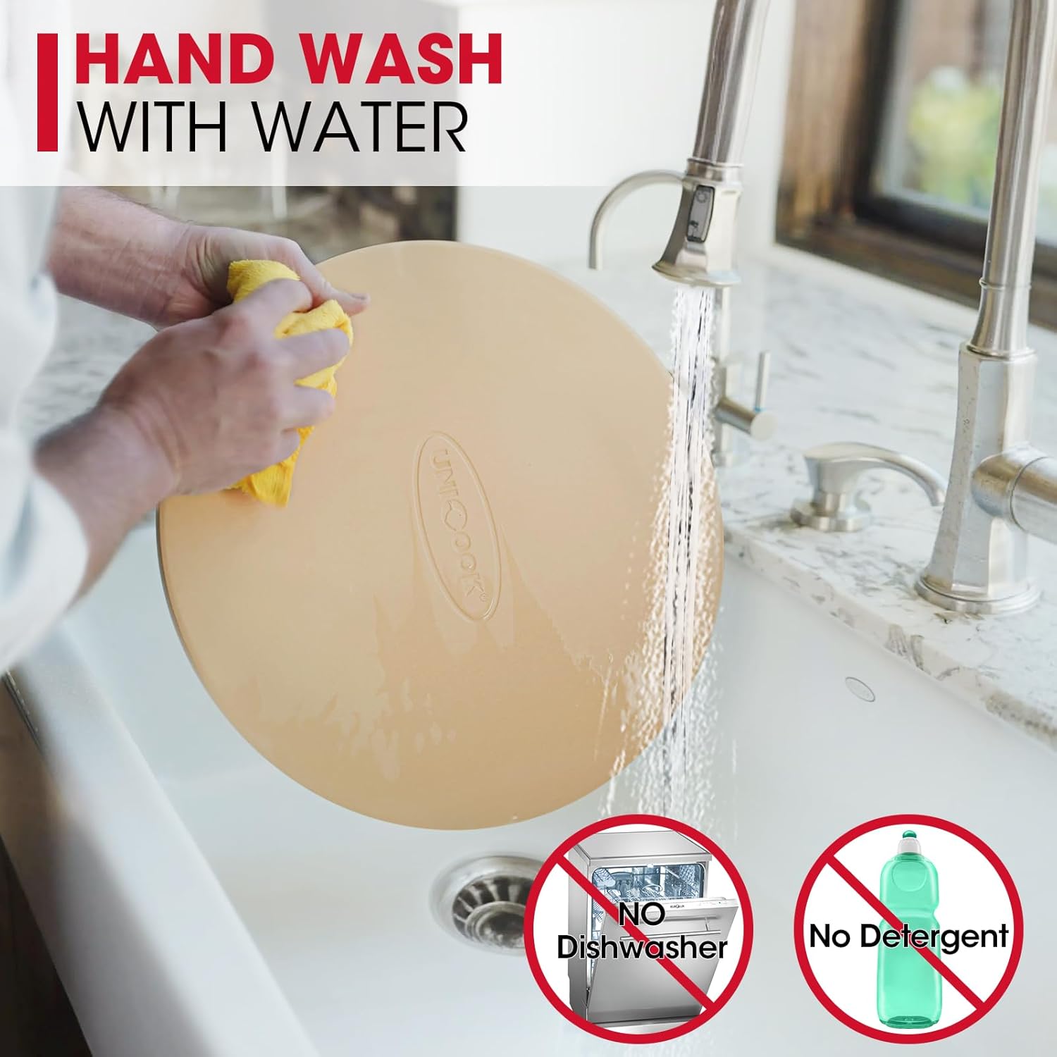 - Cleaning and Care: Hand wash with water only. Do not use detergent. A multi-purpose plastic scraper can be used as a dough cutter or to remove residue stuck to the stone. If for any reason our baking stone doesn't meet your expectations, please don't hesitate to contact us