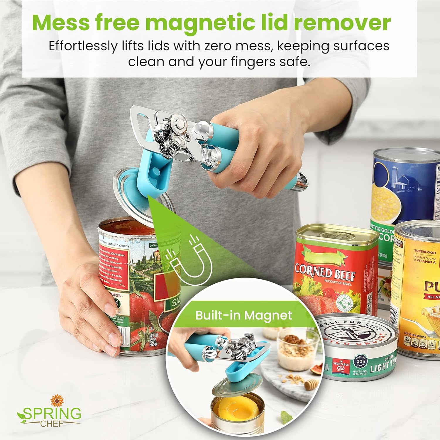 Spring Chef Stainless Steel Can Opener - Manual with Soft Grip Handles, Easy Turn, Heavy Duty Hand Can Openers for Seniors with Smooth Edge - Magnetic Lid Remover - Aqua Sky