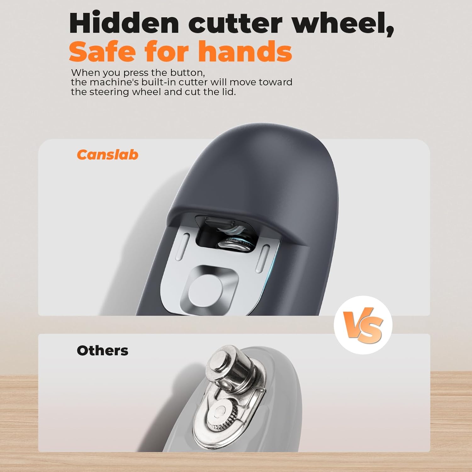 - 【Suitable for Small and Lager Cans 】- Canslab Can Opener Electric is a portable must-have kitchen gadgets. It fits practically any sizes can (not for rimless soda cans) , and gives you the best hands-free experience when preparing food. Hands-free operation are particularly beneficial for the seniors with arthritis or anyone facing challenges gripping, one-handed and left handed folks, or anyone searching for a more quicker way to open cans. Designed for standard steel food cans. Not recommended for thin-walled aluminum soda/beer cans.