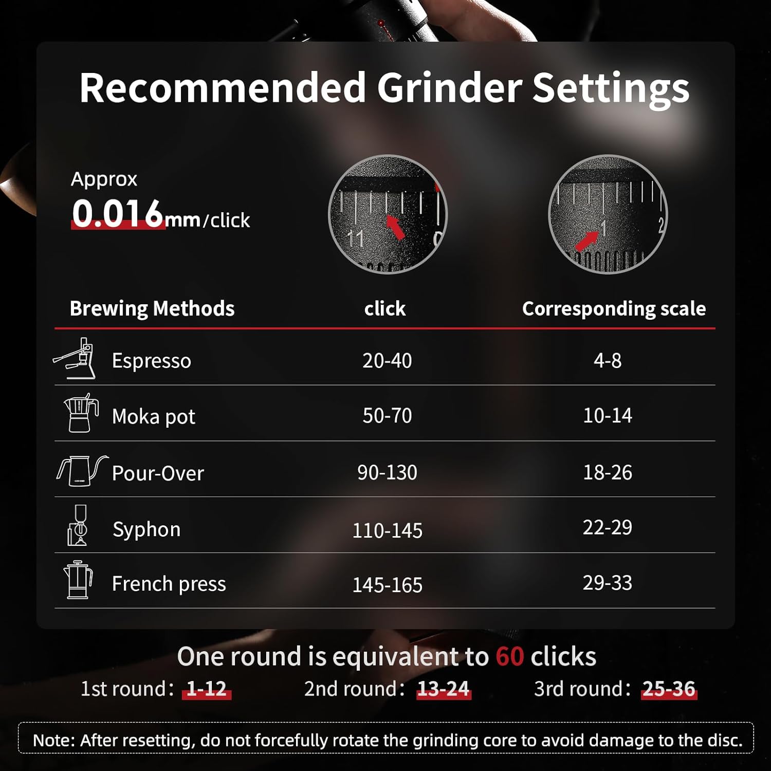 - 【Enhanced External Adjustment】Our hand coffee grinder features an intuitive external adjustment design, making it more convenient than internal adjustments. The external adjustment structure has 60 clicks a week, with a maximum of 180 clicks, even beginners can easily customize their coffee experience. Enjoy the versatility of multiple grind options, catering to espresso, mocha pot, drip coffee, siphon pot, French press, and more.