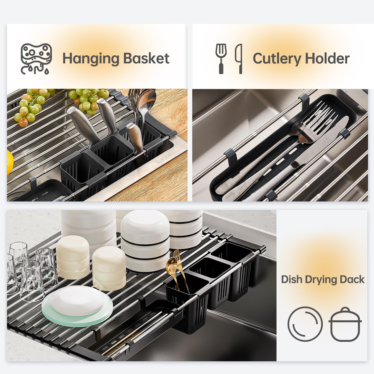 - Food Grade Material: The silicone roll-up dish drying rack is constructed from durable 304 stainless steel with BPA-free, food-safe silicone edges for safe use on fruits, veggies, cakes, etc.