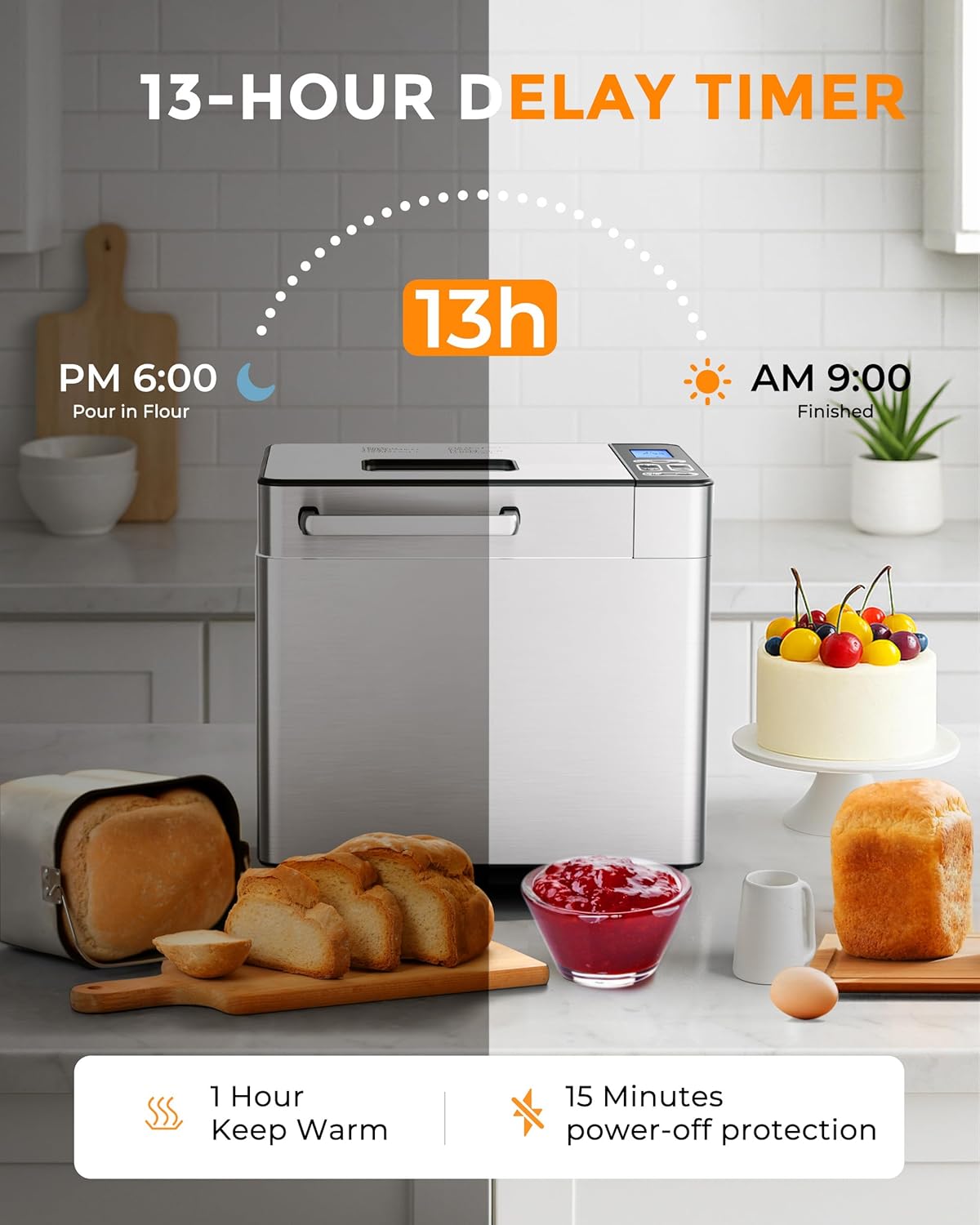- ๐๐ ๐๐จ๐ฎ๐ซ๐ฌ ๐๐ข๐ฆ๐๐ซ & ๐๐๐๐ฉ ๐๐๐ซ๐ฆ ๐๐จ๐๐: Our smart bread maker is equipped with a 13-hour delay timer, a 1-hour keep warm system, and a 15-minute power outage memory function, with our bread making machine, you can enjoy freshly baked bread anytime, whether it's in the early morning or after work. And the digital control panel of the Euhomy small bread maker makes the operation easier and more precise