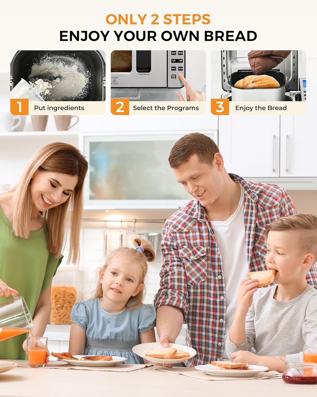 - ๐๐ซ๐๐๐ ๐ฆ๐๐ค๐๐ซ ๐๐จ๐ซ ๐๐๐ ๐ข๐ง๐ง๐๐ซ: Enjoy effortless cooking with our 25 in 1 bread maker machine. Find the program number you want to use on the machine's upper cover, while our recipe book brings you inspiration, letting you customize your own bread creation. Simply add the ingredients, select a program, and let the bread maker do the rest: from kneading to baking. ๐๐จ๐ฎ ๐๐๐ง ๐๐ฅ๐ฌ๐จ ๐ฉ๐ซ๐๐ฌ๐ฌ ๐๐๐๐ ๐ญ๐จ ๐ฉ๐๐ฎ๐ฌ๐ ๐๐ง๐ฒ๐ญ๐ข๐ฆ๐, ๐จ๐ซ ๐ก๐จ๐ฅ๐ ๐๐๐๐ ๐๐จ๐ซ ๐ ๐ฌ๐๐๐จ๐ง๐๐ฌ ๐ญ๐จ ๐๐๐ง๐๐๐ฅ ๐ญ๐ก๐ ๐ฉ๐ซ๐จ๐ ๐ซ๐๐ฆ