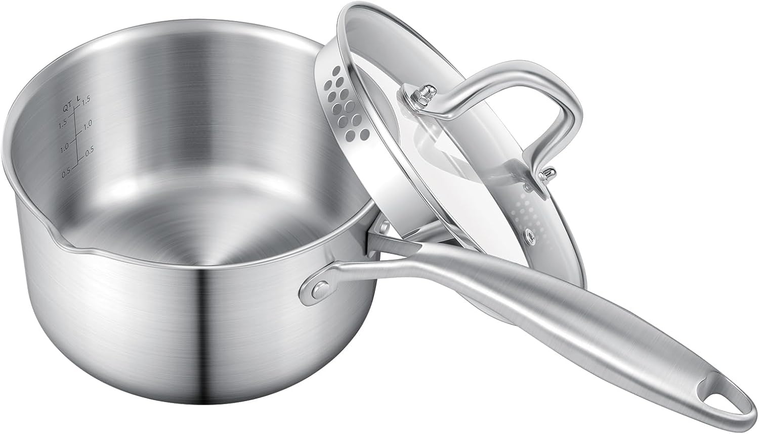 Leetaltree 1.5 Quart Stainless Steel Saucepan with Glass Strainer Lid, Thicken Tri-ply Ful Body, Multipurpose Sauce Pot with Two-Size Drainage Holes Lid, Perfect For Boiling Gravies, Pasta, Noodles