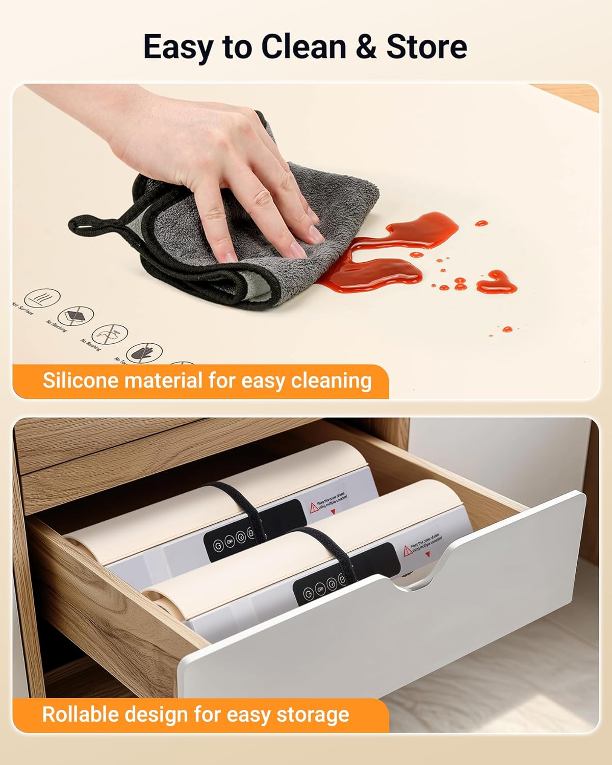 - Easy to store & Clean - Made from premium silicone nano material, this food warming mat offers durability, splash-proof protection, stain resistance, and oil resistance. Its nano-coating surface makes it easy to clean with a simple wipe. Rollable design for easy storage, making it the perfect companion for on-the-go lifestyles.
