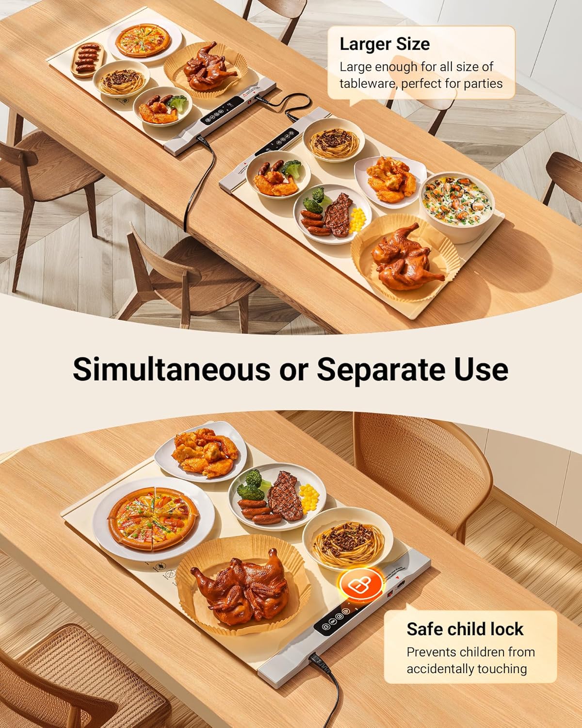 - Child Safety Lock Design - Our food warming mat are designed with a thoughtful child lock to prevent child from accidentally and ensures that the unit operates safely around children. The temperature control switch inside the movement also prevents damage and deformation caused by overheating.