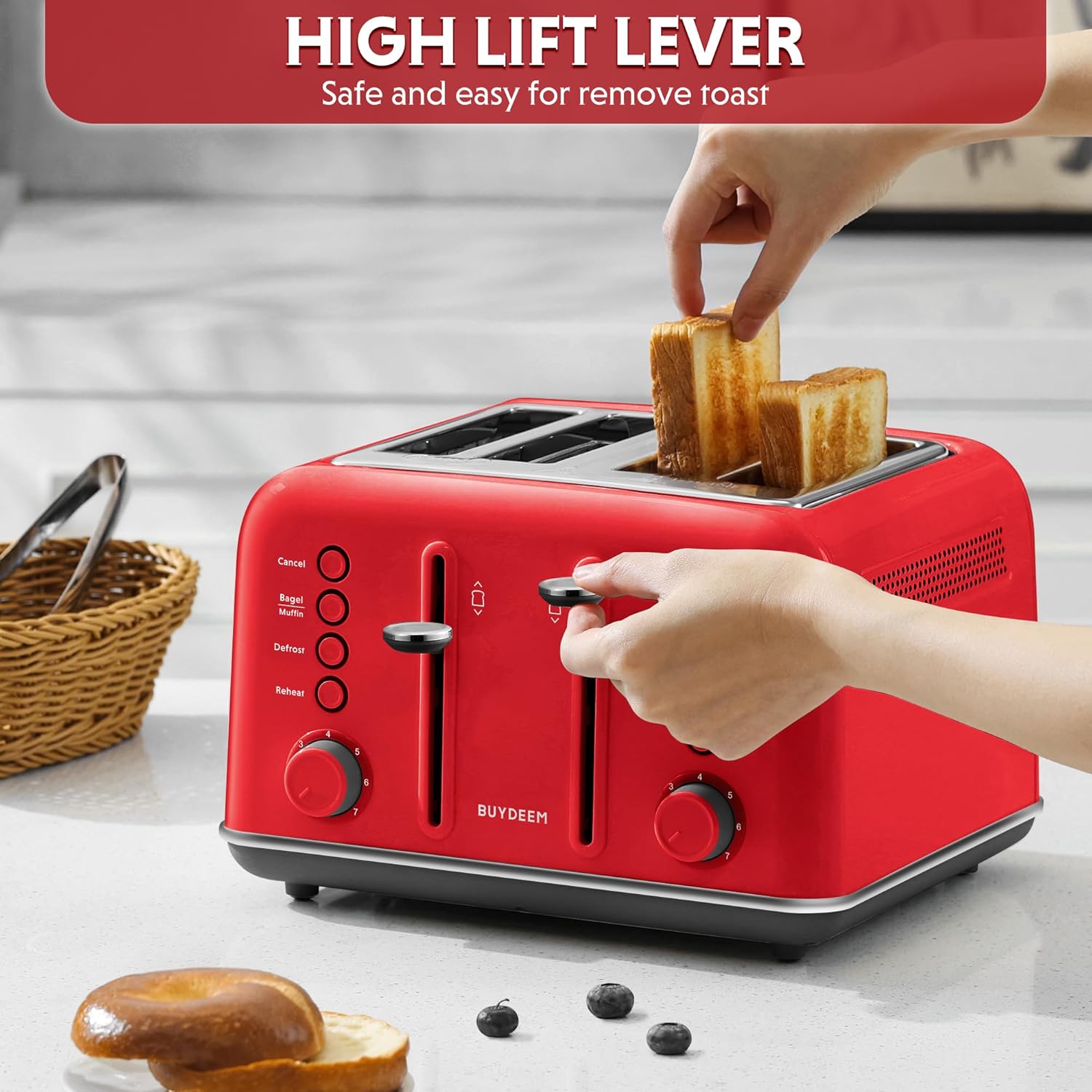BUYDEEM DT640 4-Slice Toaster, Extra Wide Slots, Retro Stainless Steel with High Lift Lever, Bagel and Muffin Function, Removal Crumb Tray, 7-Shade Settings,Red