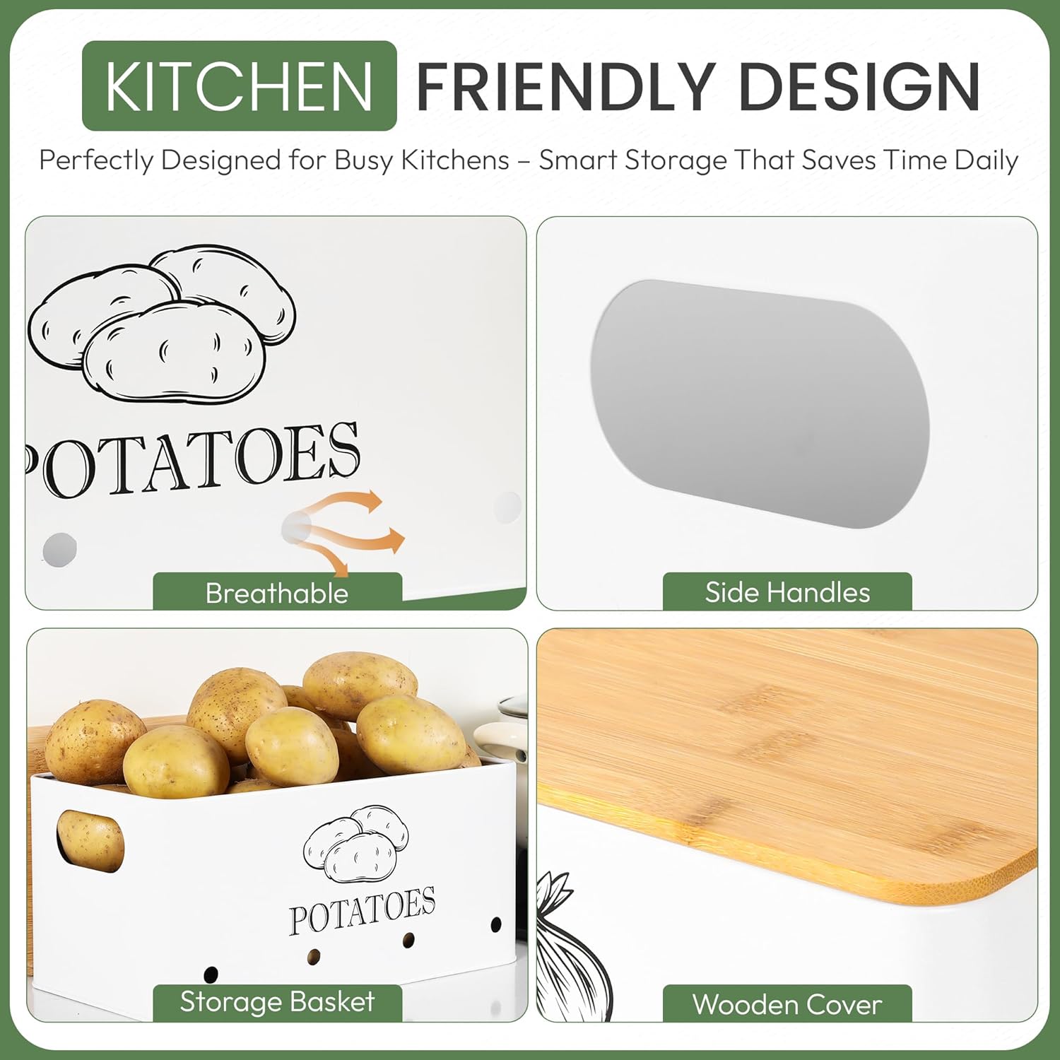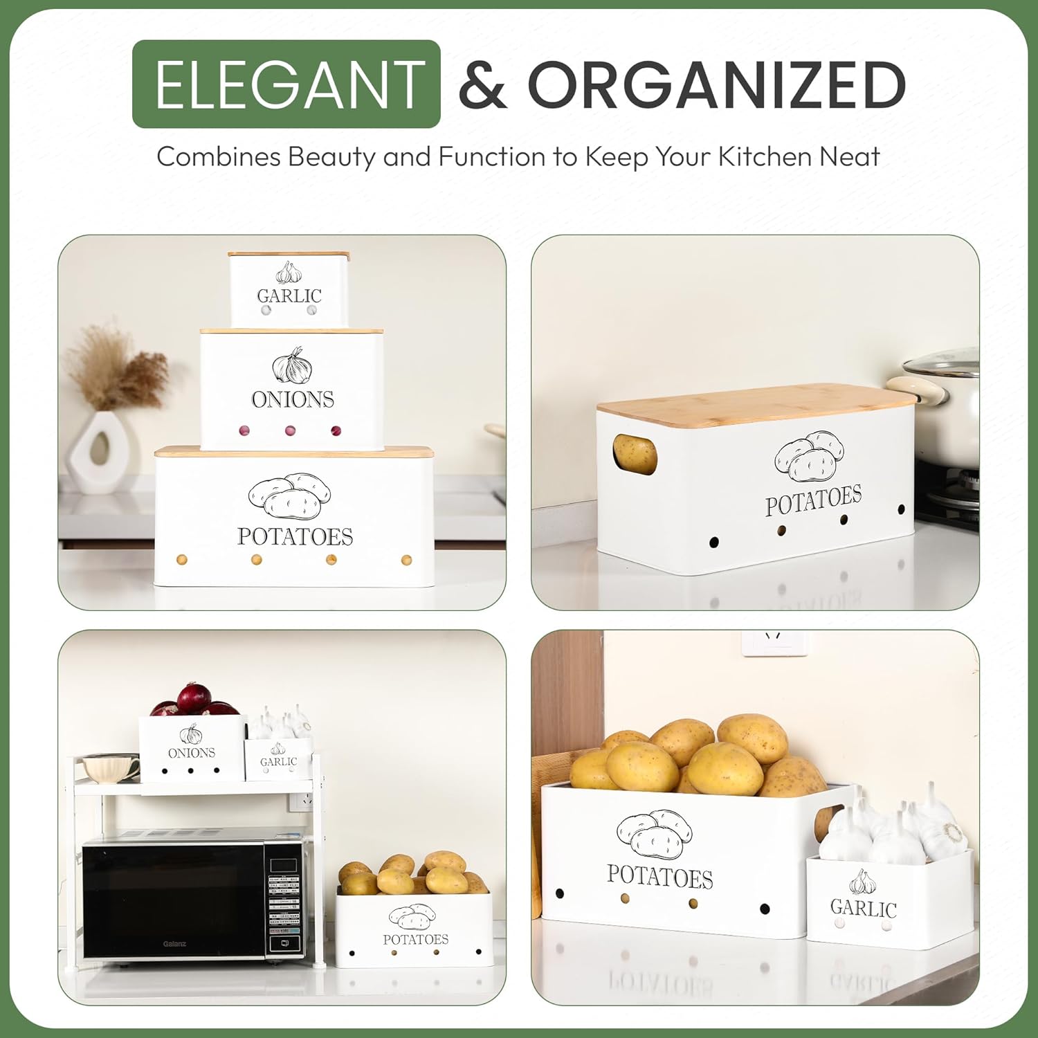 - VEGETABLE STORAGE SET onion garlic potato storage bins help you to remove clutters from your kitchen to maintain a clean countertop and keep your ingredients neatly organized with a touch of elegance and practicality.
