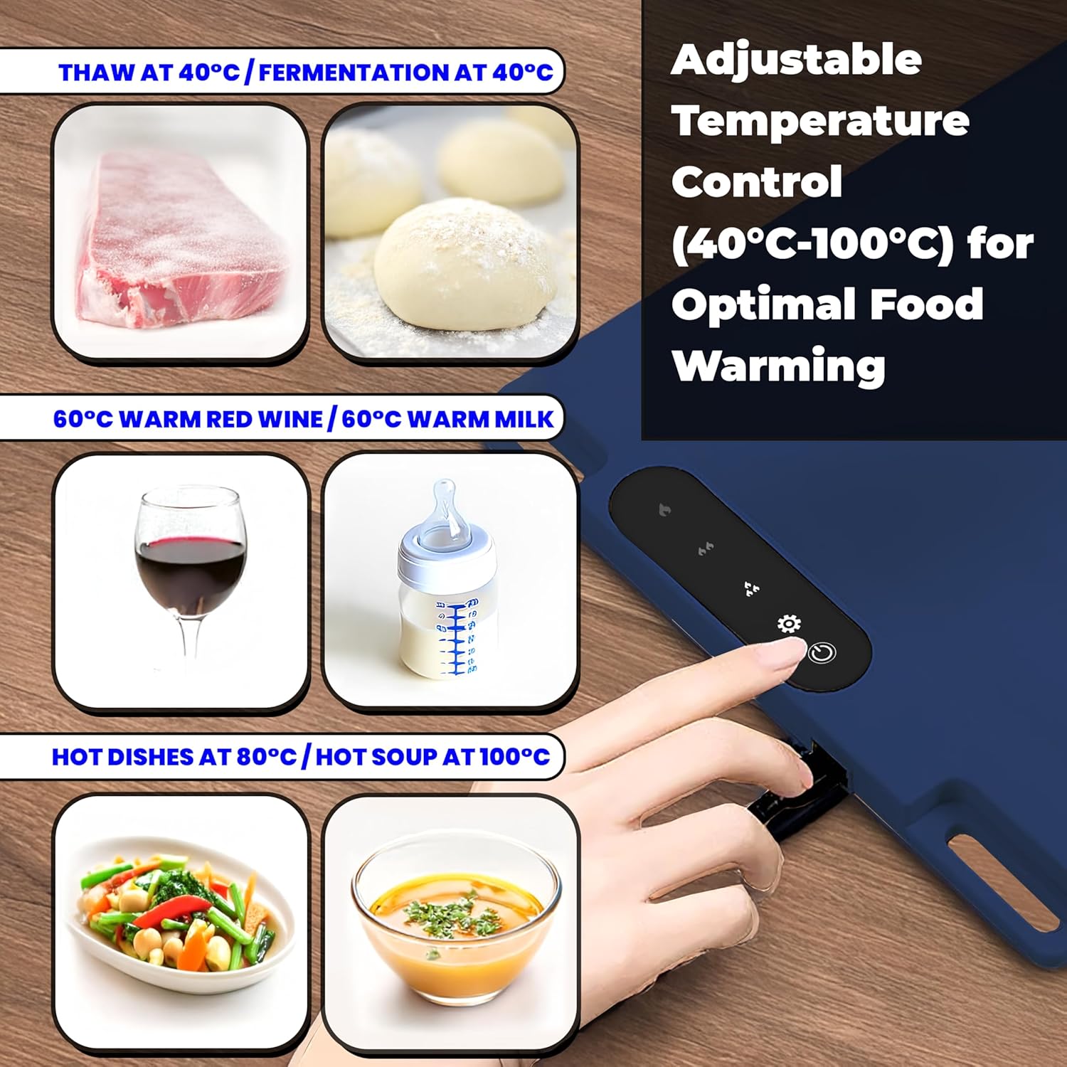 - 3-Level Temperature Control: Experience the convenience of precise temperature control for both warming and heating. Our Food Warmer Mat with 3-level temperature setting, High (212°F / 100°C), Middle (176°F / 80°C) or Low (140°F / 60°C), you can easily cater to different needs, such as keeping food warm or defrosting, making meal preparation more efficient. This feature is perfect for buffets, parties, and gatherings.
