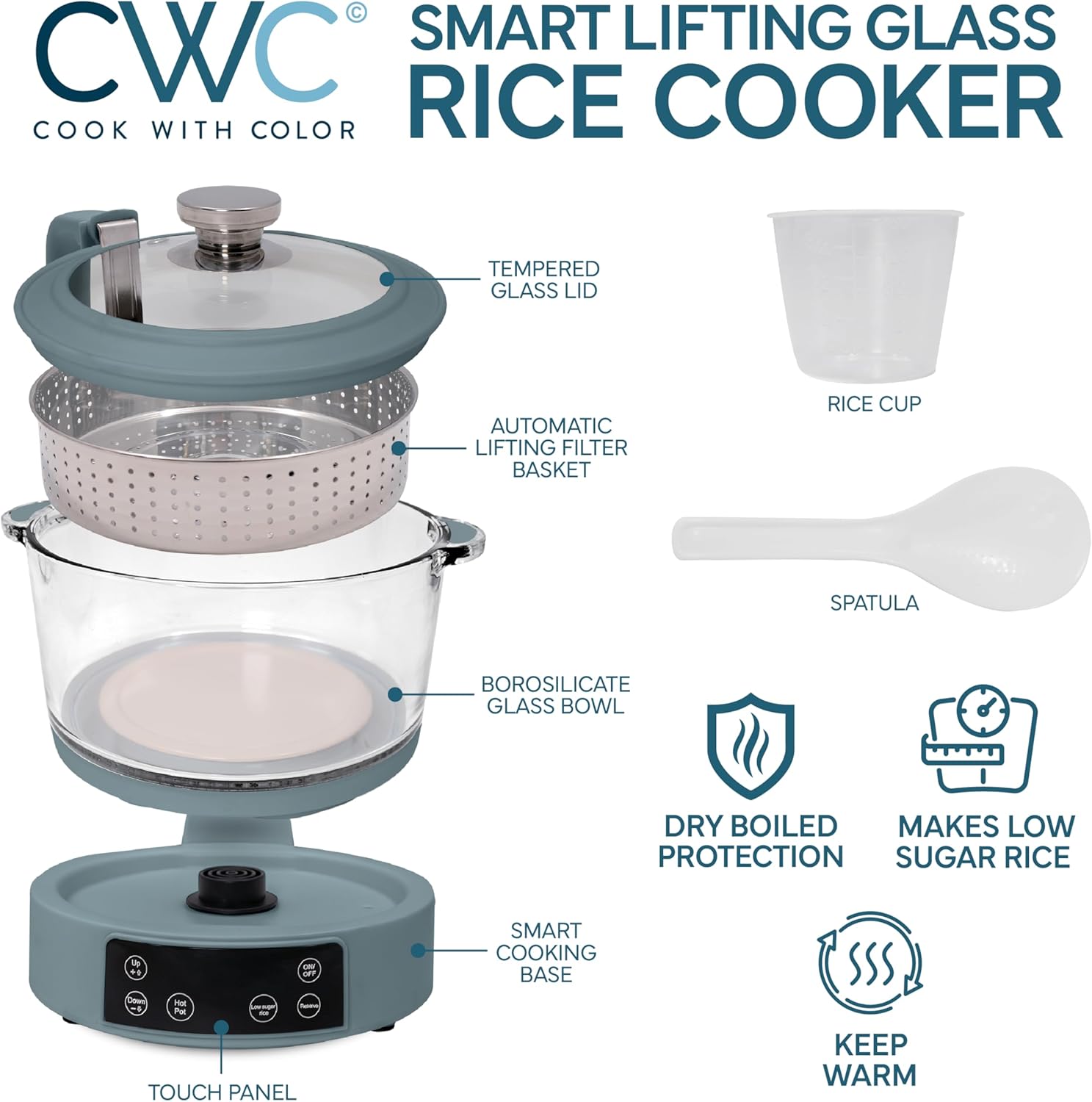 COOK WITH COLOR 3L Glass Low Carb Rice Cooker - Makes 6 Cups Low Sugar Rice with Auto Lift Filter Basket, Hotpot & Steamer for Rice, Grains and Oats, Digital Panel with Keep Warm Function, Slate Blue