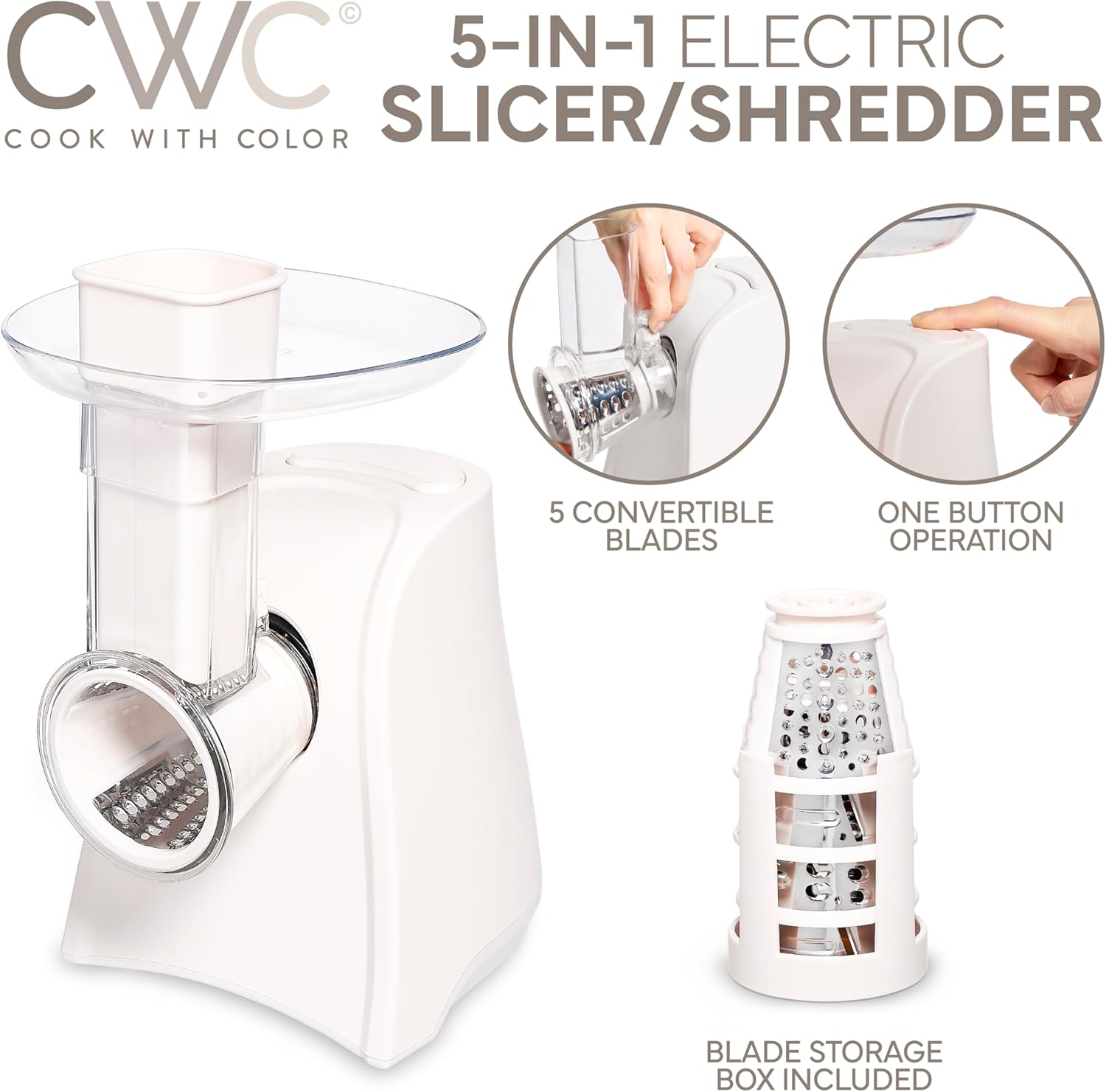 COOK WITH COLOR 5-in-1 Electric Slicer, 150W Food Prep Machine – Cheese Shredder, Fine & Coarse Graters, Potato Grater, Vegetable Slicer, Fruit, Salad Shooter, Compact Design for Bowl Prep, Cream