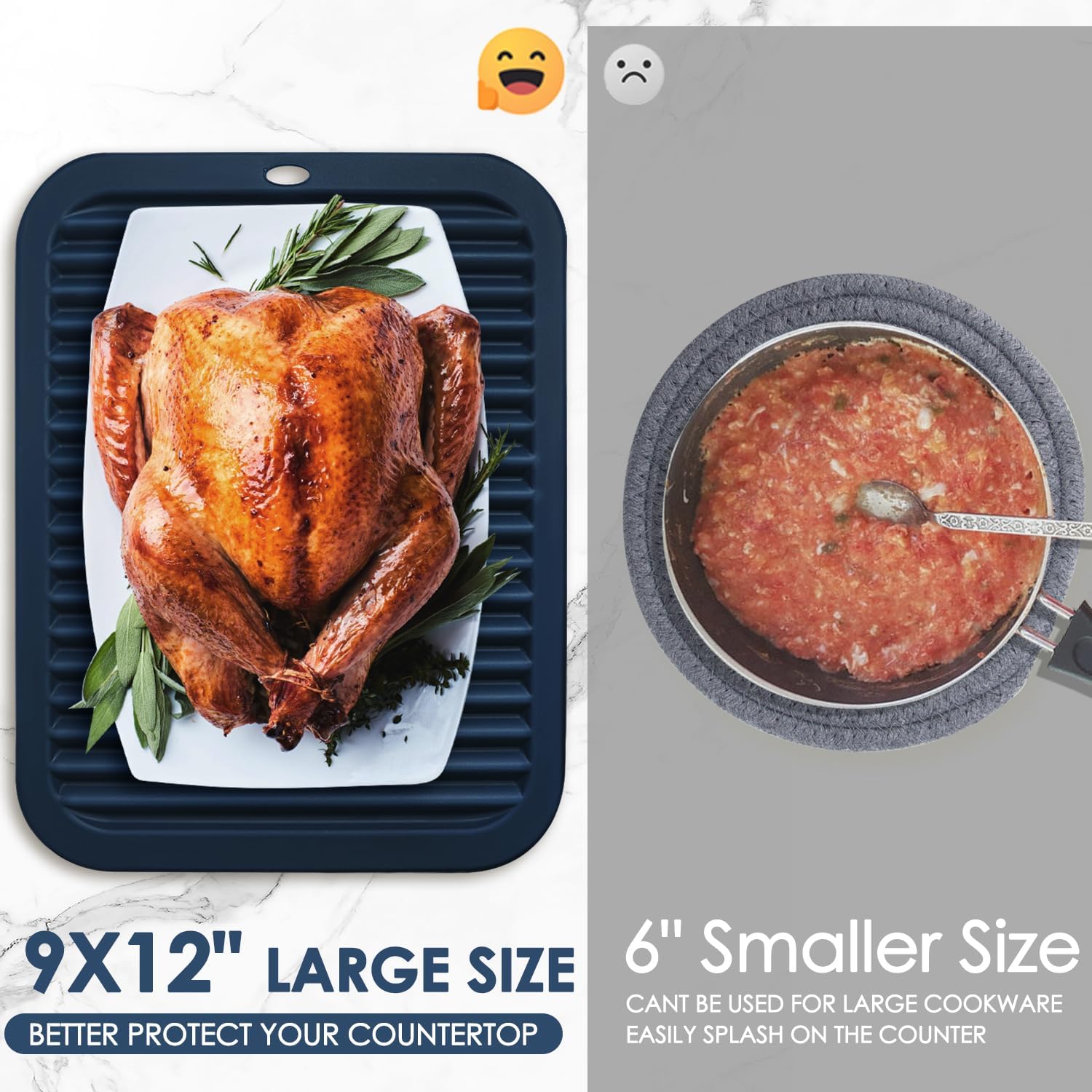 - 🥘Heat Resistant Trivets Mat: The large navy blue silicone hot pads are great for countertops & hot Items, the heat resistant trivets mat set of 2 can withstand cold and hot temperatures from -104℉ to 446℉ (-40℃ to 230℃). Reliable design helps protect quartz counter tops from hot pots, pans, drips, and spills. Help tremendously when we cook in multiple steps!