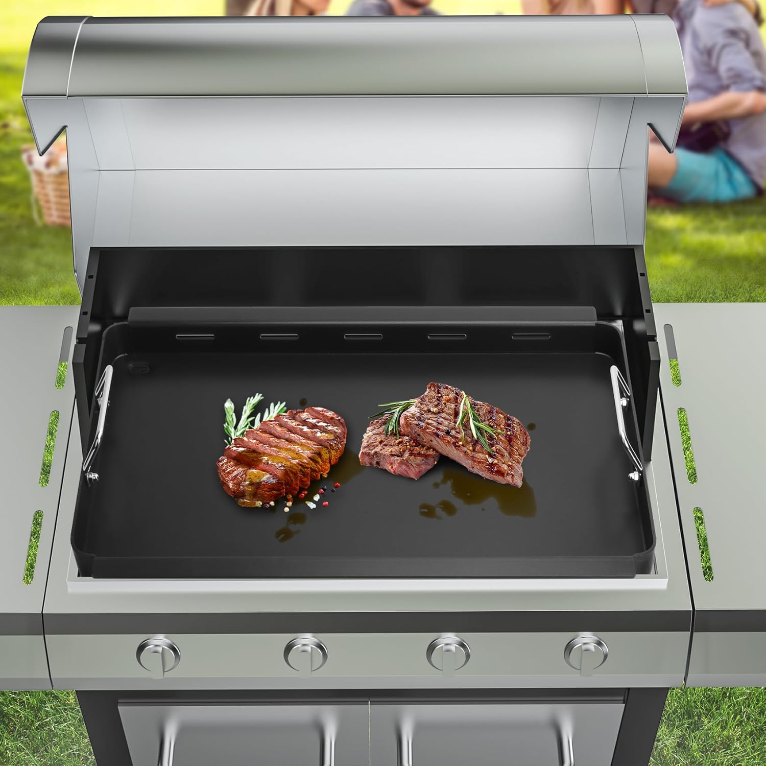 - Product size: 25.6" x 17" grill griddle repalcement parts. package includes: 1* Non-stick Carbon Steel griddle and 1*Handles. Materials: Non-stick Carbon Steel. Our grill accessories have excellent heat retention properties so that you could have a wonderful grilling experience while cooking.