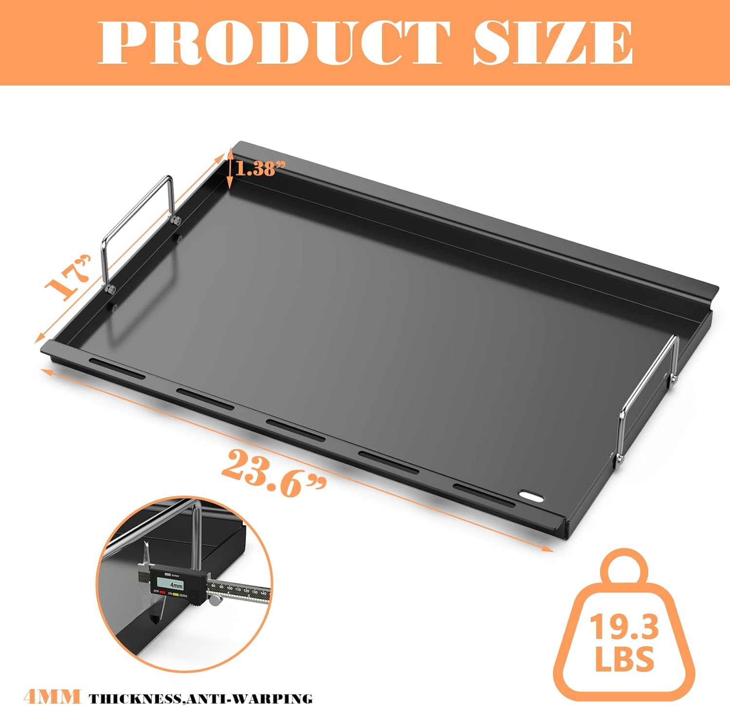 - Product size: 23.6" x 17" grill griddle repalcement parts. package includes: 1* Non-stick Carbon Steel griddle and 2*Handles. Materials: Non-stick Carbon Steel. Our grill accessories have excellent heat retention properties so that you could have a wonderful grilling experience while cooking.