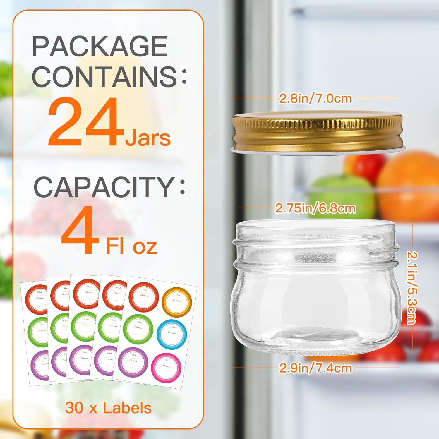 - SET INCLUDES: The package includes 24 pack 4oz Mason Jars, 24 gold one-piece lids, and 30 sheet small stickers for labeling contents. All items are securely packaged to ensure they arrive in good condition, providing everything you need