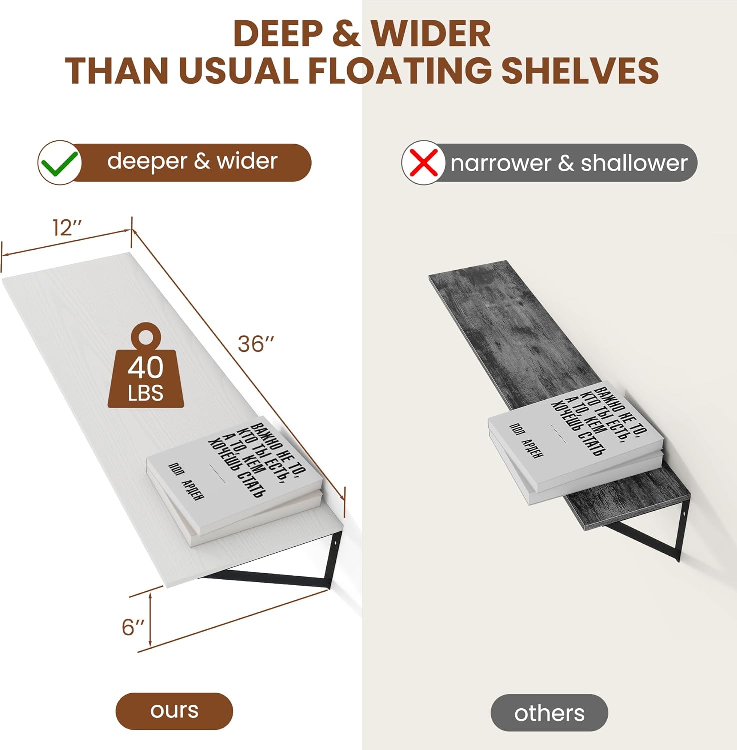 Heimlove White Deep Floating Shelves for Wall, 36W x 12D Wood Wall Shelves Set of 2, Wide Floating Bookshelf for Living Room, Kitchen, Office, Bedroom and Decor Storage, with Black Bracket - White