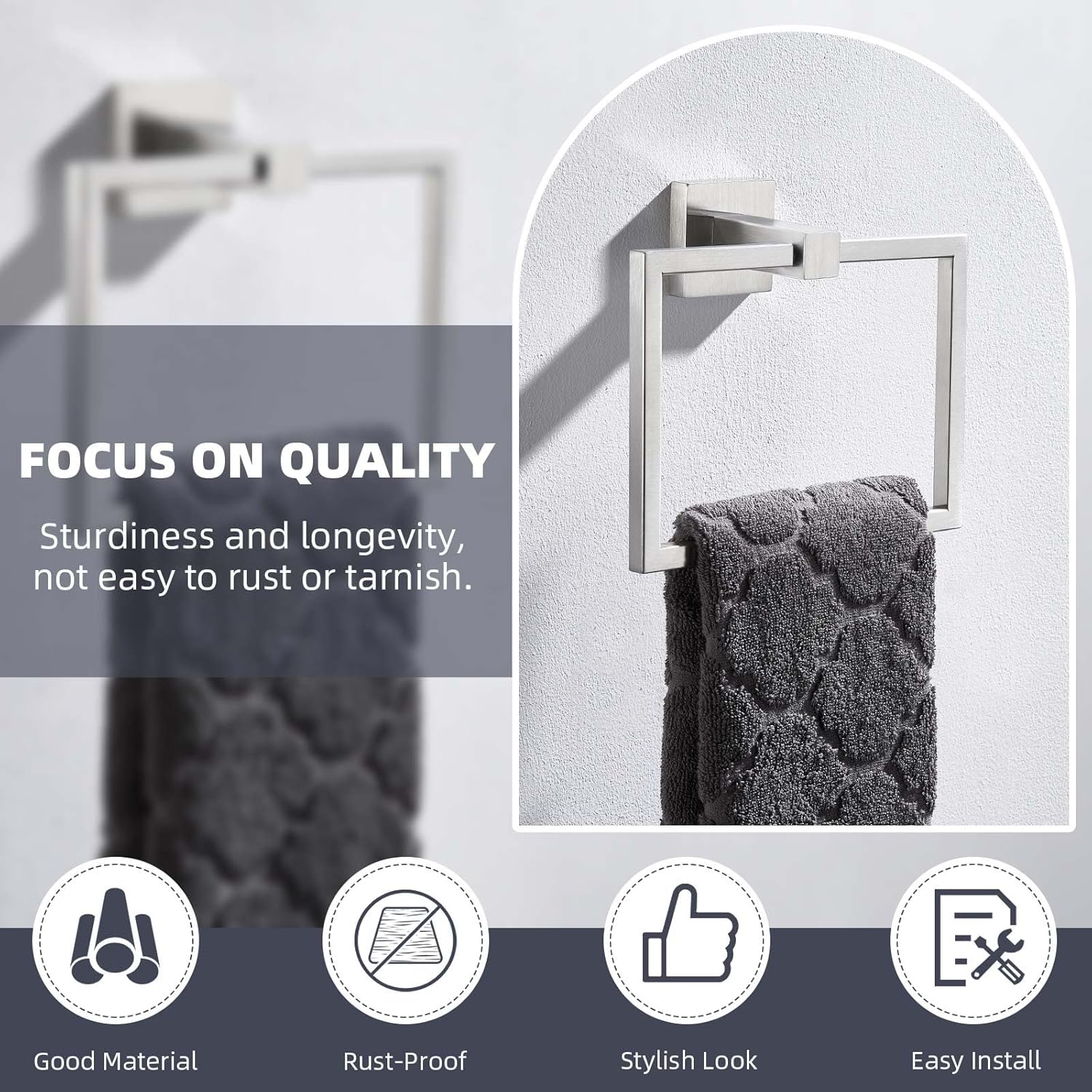 - BENEFICIAL FOR TOWEL DRYING: distance between wall and ring is 2-3/16"(56mm), not extend out far, leave enough space for towels drying, square ring for better towels spreading