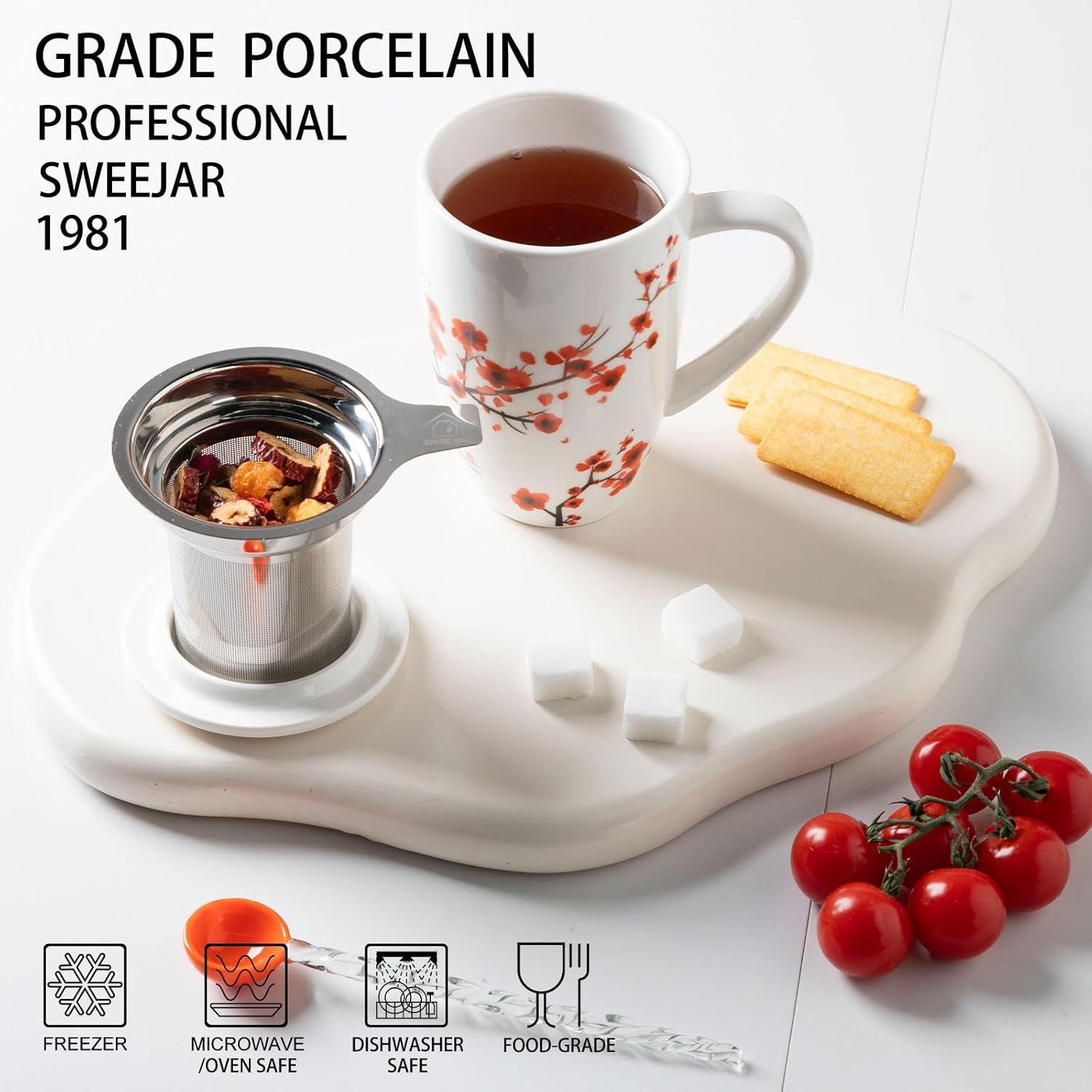 Sweejar Porcelain Tea Mug with Infuser and Lid,Teaware with Filter, Loose Leaf Tea Cup Steeper Maker, 16 Fl Oz for Tea/Coffee/Milk/Women/Office/Home/Gift (Plum Blossom)
