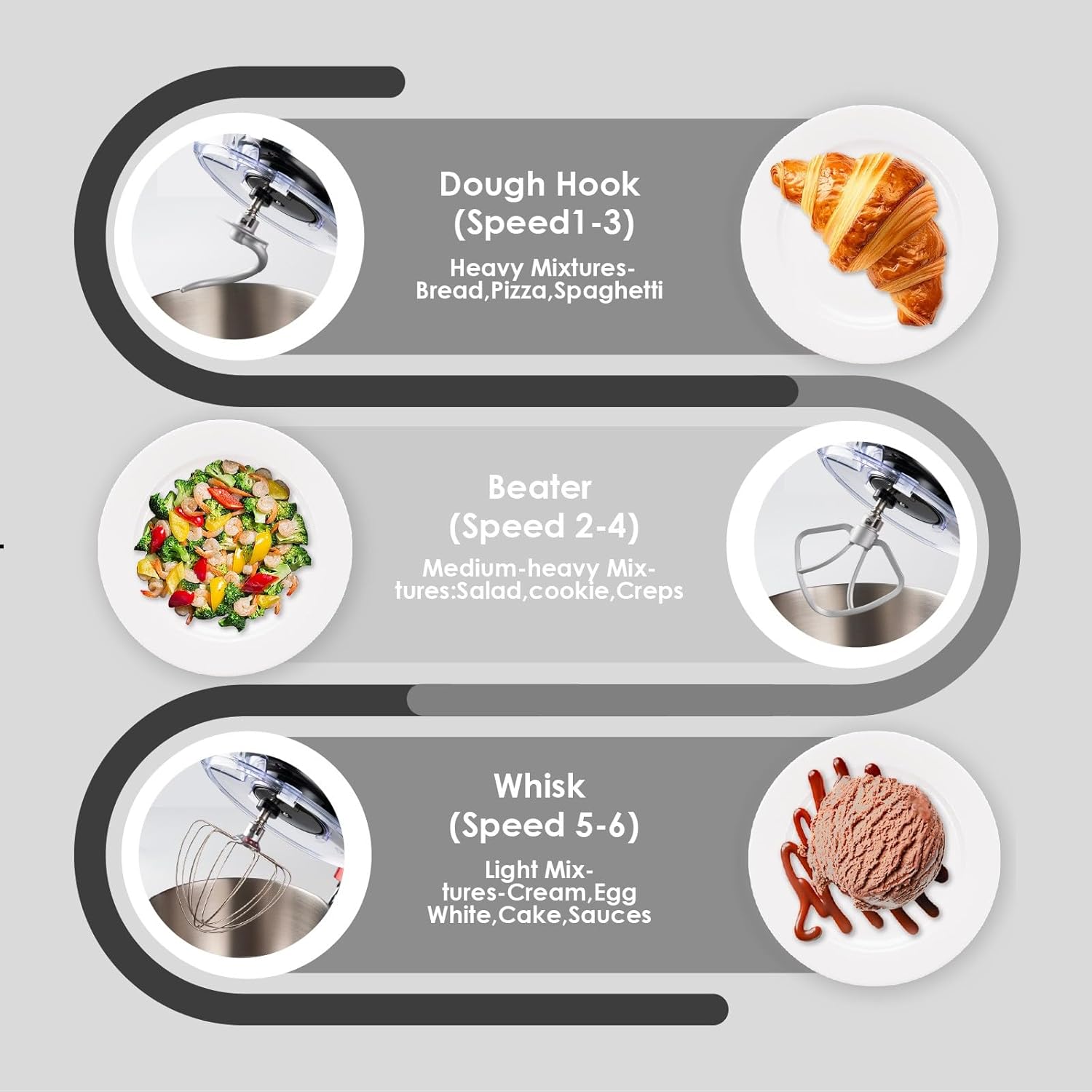 - 6 Speed, Easy to Use: This kitchen mixer features six adjustable speed settings and easy operation to meet your diverse mixing needs. The tilt-head feature allows for effortless switching between bowls and attachments.Its intuitive design ensures ease of use, making it ideal for both beginners and experienced bakers, delivering reliable performance for baking tasks.