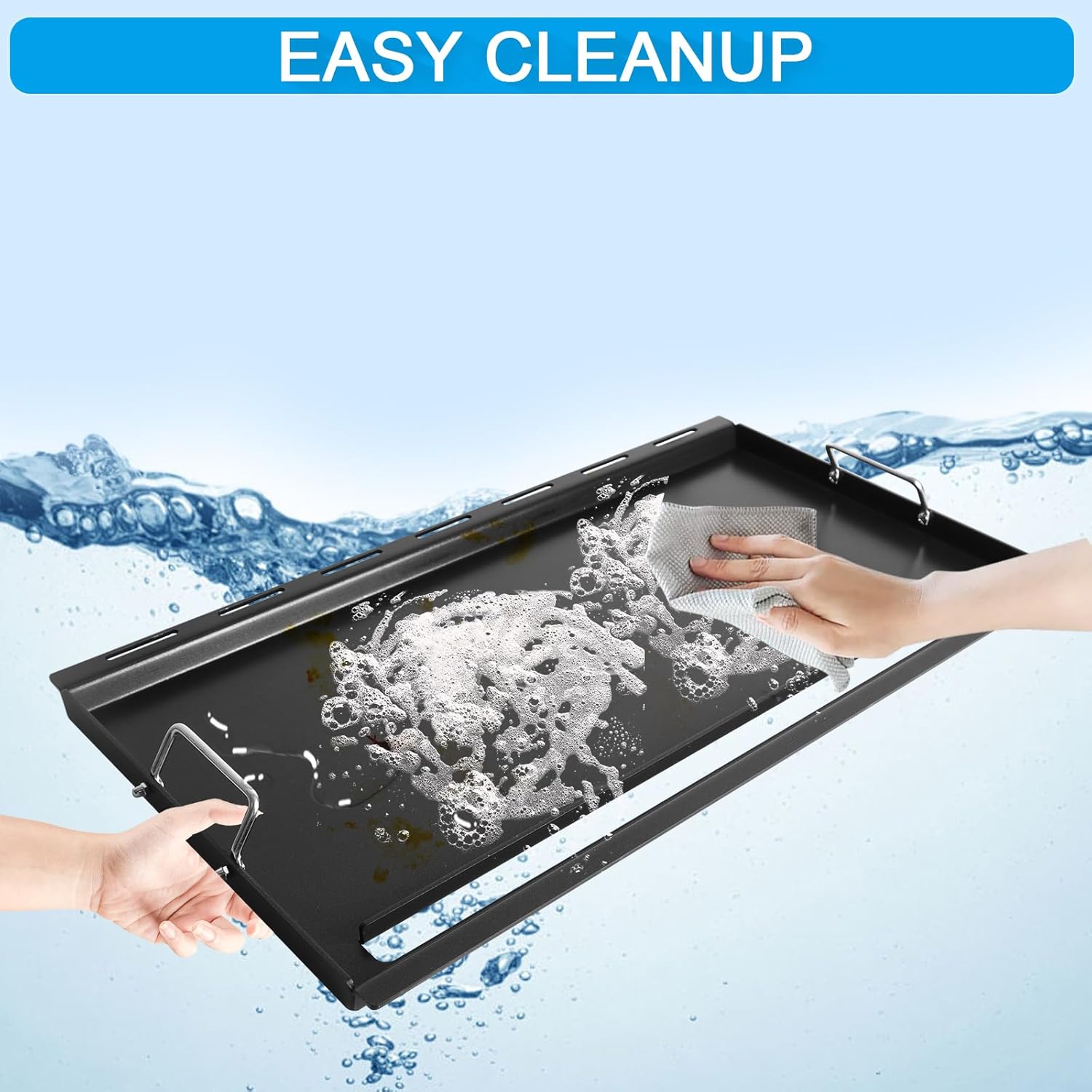- Practical Flat Top Griddle: The grill griddle inserts comes with removable handles and heat-resistant gloves so you can pick it up and hold it safely and comfortably. The built-in grease trap prevents spills and keeps the cooking area clean and tidy throughout the cooking process, making your cooking experience both safe and efficient