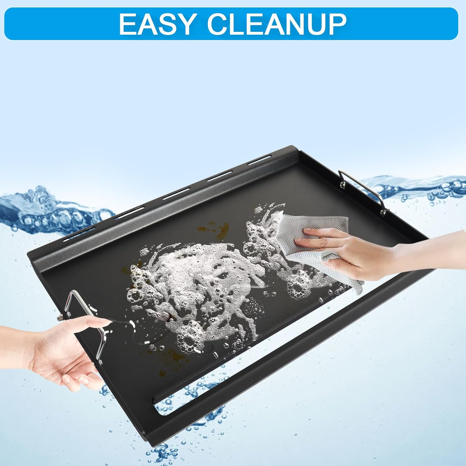 - Upgraded Flat Top Griddle: The grill griddle inserts comes with removable handles and heat-resistant gloves so you can pick it up and hold it safely and comfortably. The built-in grease trap prevents spills and keeps the cooking area clean and tidy throughout the cooking process, making your cooking experience both safe and efficient