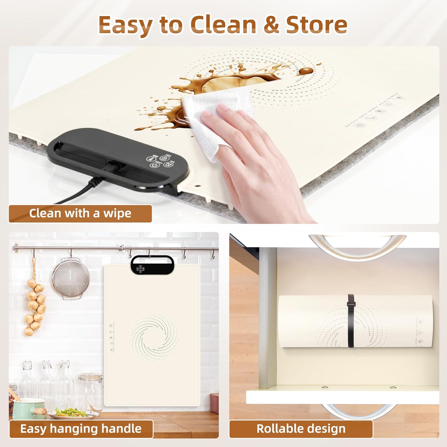 - [Hanging & Rollable Storage]: Hang the silicone heating mat for food instantly with its handle. Its shape-resistant, rollable design ensures smooth, wrinkle-free rolling. Includes a free strap and storage bag for easy, space-saving storage