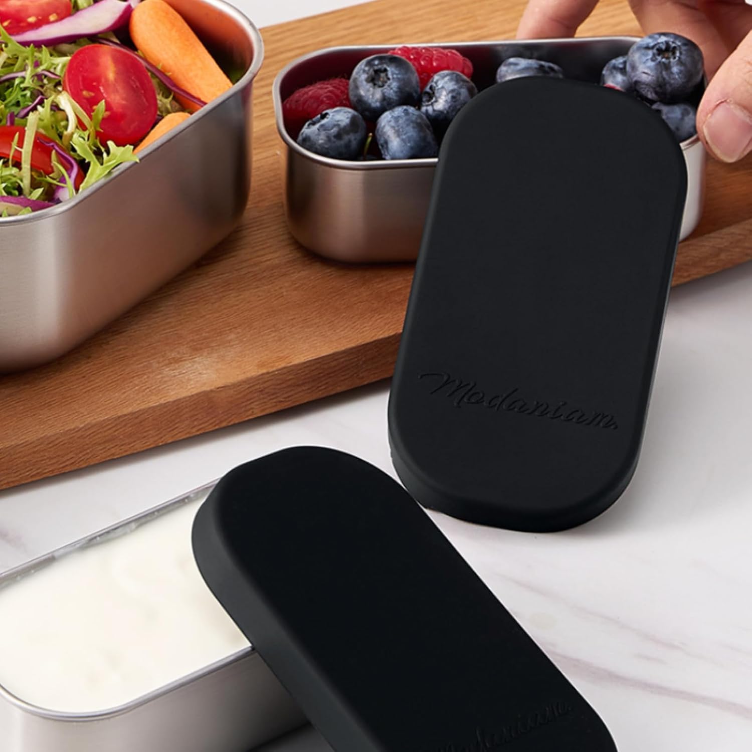 - SET CONTAINS: Two x 6.5 Oz steel containers with silicone Lids . Ideal for Dressing, Nuts, Dips, berries, grapes, small fruit pcs, snacks. This small contaienr also fits inside Modaniam 27 OZ and 42 Oz containers and can be used to carry side dishes with meals.