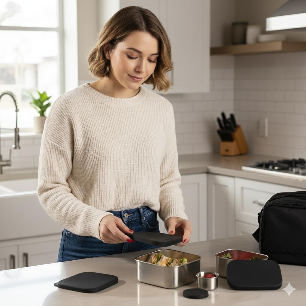 - STYLISH DESIGN: LUNCH BOX This sleek stainless steel bentobox for adults / stainless steel lunch box features a contoured outer shell with A matte design . From the office to the on-the-go, youโll turn heads with this stylish lunch box that not only looks fresh but keeps food fresh!