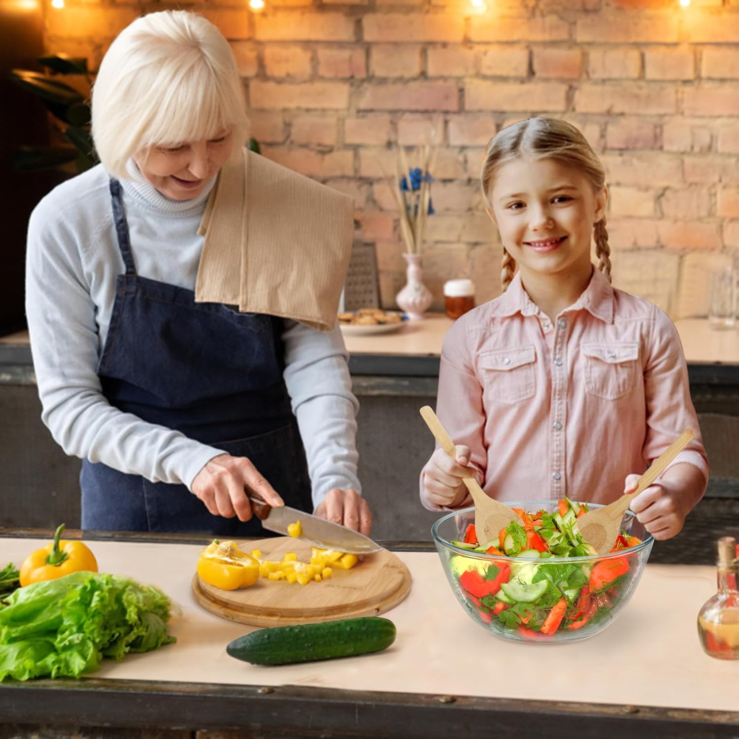 - 【Bamboo Wooden Lid & Salad Tongs】: The bamboo lid stays on the top of the glass bowl, easy on and off to keep the salad fresh, and the lid is multiple use as cutting board and serving trays for your convenience. There’s a pair of salad tongs built in the lid, no need to find the salad serving utensil anywhere anymore, especially when you’re taking salad to a potluck. And the sering spoon and fork are make of natural bamboo, not easy to break and safe to use.